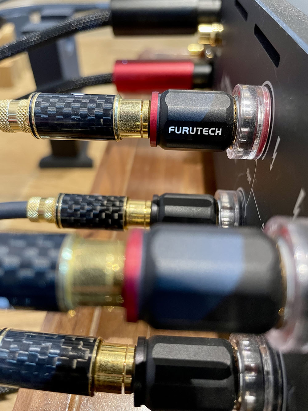 ขั้วต่อสายลำโพงที่ให้มา 2 ชุด สำหรับแชนเนลซ้ายและแชนเนลขวาเป็นของแบรนด์ Furutech ของดีจากประเทศญี่ปุ่น ส่วนสายสัญญาณที่ใช้เชื่อมต่อระหว่างขั้วต่อสายลำโพงฟูรูเทคไปยังแผงวงจรของภาคแอมปลิฟายเป็นสายสัญญาณของ Kubala-Sosna จากประเทศสหรัฐอเมริกา นี่ก็ของดีเหมือนกัน