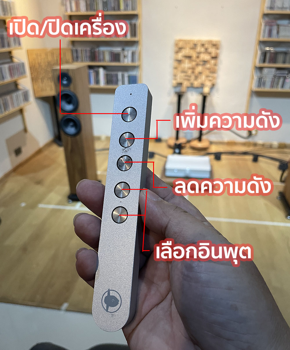 ทางแรกคือผ่านทางรีโมทไร้สายที่แถมมาให้ ซึ่งมีรูปร่างเล็กกระทัดรัด บอดี้ภายนอกทำด้วยโลหะสีบรอนซ์เงิน มีปุ่มให้กดใช้งานอยู่ทั้งหมด 5 ปุ่ม สามารถใช้สั่งเปิด/ปิดเครื่องได้ โดยกดปุ่มบนสุดค้างไว้ประมาณ 2 วินาที ส่วนอีกสองปุ่มที่อยู่ถัดลงไปใช้กดเพื่อปรับเพิ่ม/ลดระดับความดัง และสองปุ่มด้านล่างลงมาใช้กดเลือกอินพุตที่ปรับตั้ง preset เอาไว้