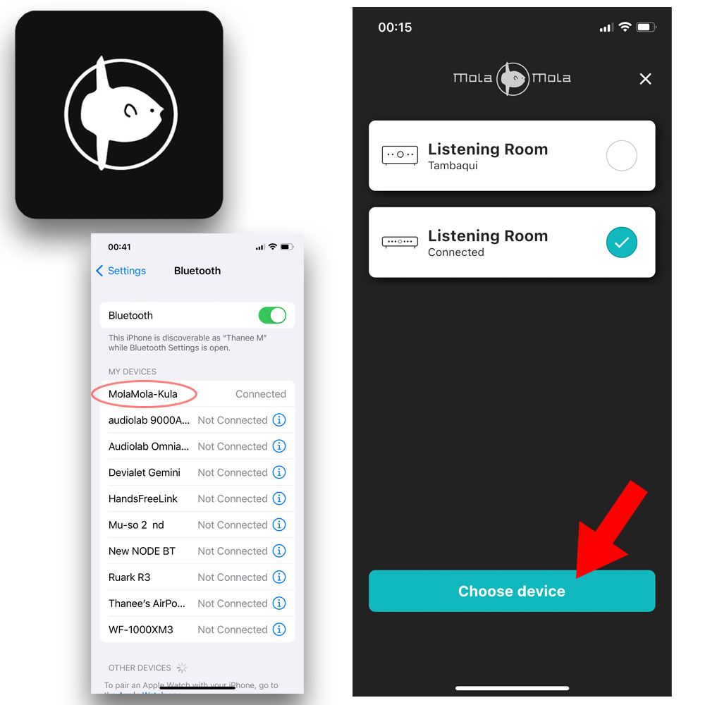 ในตัว Kula มีฝังโมดูล Bluetooth เอาไว้สำหรับเชื่อมต่อกับแอพลิเคชั่นที่ชื่อว่า ‘Mola Mola Remoteที่พวกเขาออกแบบมาไว้ให้ใช้กับ Kula และผลิตภัณฑ์ตัวอื่นๆ ของ Mola Mola ซึ่งแอพฯ ตัวนี้มีทั้งเวอร์ชั่น iOS และ Android คุณสามารถโหลดมาใช้ได้ฟรี เมื่อติดตั้งแอพฯ เข้ากับ iPhone 12 ของผมเสร็จปั๊บ มันก็ทำการเปิดฟังท์ชั่น bluetooth ของ iPhone 12 ของผมเพื่อทำการเชื่อมต่อกับอุปกรณ์ของ Mola Mola ที่อยู่ใกล้กันทันที ผมไม่ต้องเข้าไปยุ่งกับขั้นตอนเชื่อมต่อแต่อย่างใด หลังจากแอพฯ Mola Mola Remote บน iPhone 12 ของผมเชื่อมต่อกับ Kula ได้แล้ว มันจะปรากฏชื่อของ Kula ขึ้นมาให้เลือกควบคุมใช้งาน ซึ่งขั้นตอนการใช้งานก็ง่ายมาก คุณแค่จิ้มปลายนิ้วลงไปที่วงกลมด้านหลังชื่อ Kula ให้มีเครื่องหมายถูกขึ้นมา จากนั้นก็กดลงไปที่ปุ่มสีเขียว ‘Choose Device’ (ลูกศรชี้) ที่อยู่ด้านล่างเพื่อเข้าไปสั่งงานตัว Kula