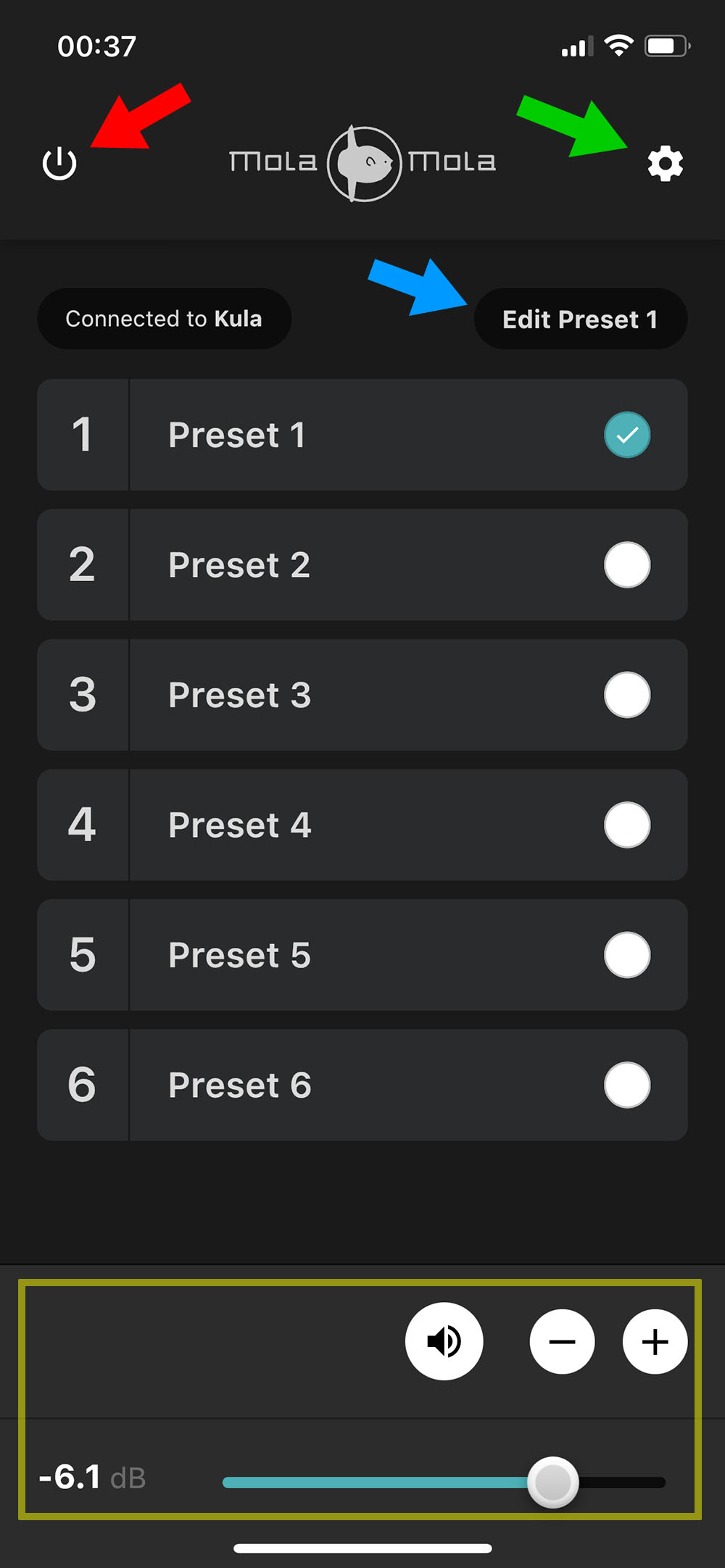 เมื่อกดเข้ามาที่หน้าแรกของแอพฯ จะพบกับอ๊อปชั่นการสั่งงานอยู่ 4 ฟังท์ชั่น เริ่มจากปุ่มเปิด (on) / ปิด (standby) เครื่อง (ลูกศรสีแดง), รูปฟันเฟือง (ศรสีเขียว) ซึ่งเป็นช่องทางกดเข้าไปปรับตั้งเมนูของเครื่อง, ที่ลูกศรชี้สีฟ้านั้นคือปุ่มกดเพื่อเข้าไปทำการปรับตั้งค่า preset ของอินพุตหมายเลข 1 ที่ถูกเลือกใช้อยู่ในขณะนั้น ถ้าคุณกดเลือกอินพุตอื่น อย่างเช่น อินพุต 2 ที่ปุ่มนี้ก็จะเปลี่ยนเป็น ‘Edit Preset 2ส่วนในกรอบสีเหลืองด้านล่างนั้นเป็นฟังท์ชั่นที่ใช้ในการปรับเพิ่ม/ลดวอลลุ่ม ซึ่งในการปรับวอลลุ่มจะใช้วิธีลากสไลด์เส้นสีฟ้าไปทางซ้าย (ลด) / ขวา (เพิ่ม) หรือใช้วิธีกดบนปุ่ม – / + ก็ได้เหมือนกัน