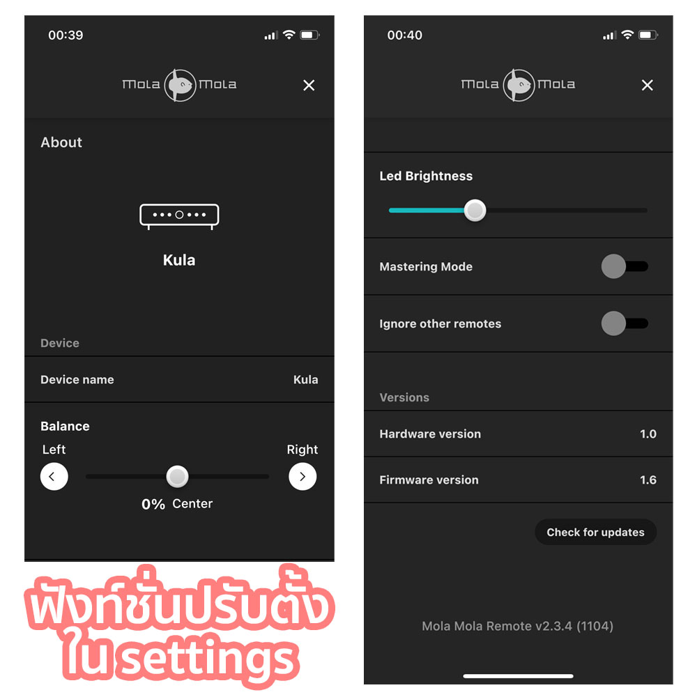 ในเมนู settings ที่เป็นรูปฟันเฟือง มีหัวข้อเมนูย่อยให้ทำการปรับตั้งค่าทั้งหมด 5 – 6 อย่าง อาทิ ตั้งชื่อได้, ปรับบาลานซ์ซ้ายขวาได้, ปรับความสว่างของไฟ LED บนแผงหน้าของตัวเครื่องได้, เช็คและเลือกอัพเฟิร์มแวร์ได้, นอกจากนี้ คุณยังสามารถสั่งปิดรับการสั่งงานจากรีโมทไร้สายได้ ถ้าต้องการควบคุมการทำงานของ Kula ผ่านทางแอพลิเคชั่นอย่างเดียว ส่วนฟังท์ชั่น ‘Mastering Modeนั้นมีไว้ให้ใช้กรณีที่คุณต้องการฟังเทียบ A/B Test ระหว่างอุปกรณ์ 2 ตัวที่เชื่อมต่ออยู่กับ 2 อินพุตของ Kula ซึ่งเมื่อเปิดใช้ฟังท์ชั่นนี้ ระบบ DSP ภายในตัวเครื่องจะทำการเชื่อมต่อสัญญาณแต่ละอินพุต เร็วกว่าปกติเพื่อทำให้การฟังเทียบระหว่าง A vs B ไม่ทิ้งช่วงรอนาน