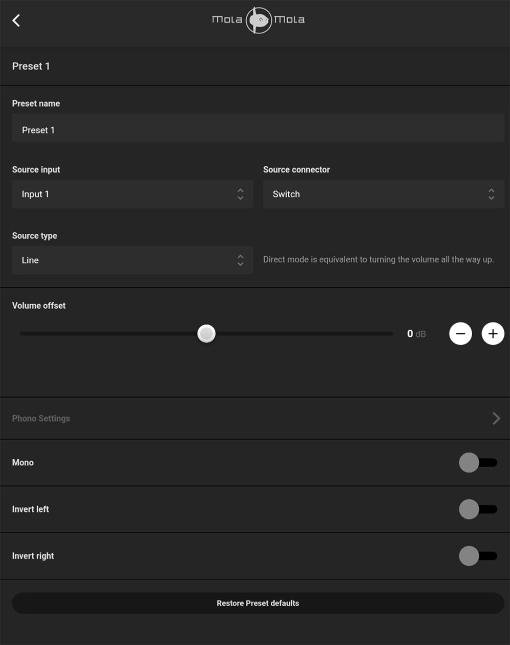 แต่ละอินพุตของ Kula สามารถกำหนดตั้ง preset ได้ เมื่อแตะเข้าไปที่ปุ่ม Edit Preset xแอพลิเคชั่นจะพาคุณเข้าไปที่หน้าปรับตั้งค่าของอินพุตนั้น ซึ่งในนั้นมีหัวข้อย่อยให้ปรับตั้งเกือบสิบหัวข้อ อาทิเช่น ตั้งชื่อ preset, ตั้งชื่ออินพุตของแหล่งต้นทาง, สามารถเลือกลักษณะการสลับขั้วต่อระหว่าง XLR กับ RCA ได้ว่าจะให้สลับได้ด้วยการโยกสวิทช์เล็กๆ ที่อยู่บนแผงหลัง หรือจะให้ตั้งคงที่ไว้ที่ XLR หรือ RCA, มีรูปแบบอินพุตให้เลือก 3 แบบคือ LinePhonoDirect กรณีเลือกตั้งให้เป็นอินพุตแบบ direct คือไม่ผ่านวอลลุ่มของ Kula ก็ได้ ตรงนี้มีไว้ให้เลือกใช้กรณีที่คุณนำ Kula ตัวนี้ไปใช้งานร่วมกับชุดโฮมเธียเตอร์ โดยกำหนดอินพุตนี้ให้เป็น bypass ไปใช้วอลลุ่มจากตัวโปรเซสเซอร์ในการควบคุมความดังของอินพุตนี้ และถ้าตั้งเป็นอินพุต Phono จะมีอ๊อปชั่นให้ปรับตั้งค่าของภาคขยายหัวเข็มได้อีกเยอะ ละเอียดมาก ที่ชอบมากคือมันมี EQ Curve ของค่ายตัดแผ่นยุคเก่าๆ มาให้เลือกใช้ครบๆ เลย, สามารถปรับตั้งระด้ับเกนอ๊อปเซ็ตของวอลลุ่มได้, ปรับตั้งเอ๊าต์พุตให้เป็นโมโนได้ด้วยการเอาสัญญาณซ้าย/ขวามารวมกัน, สามารถสลับเฟสของสัญญาณแชนเนลซ้าย/ขวาได้ รวมถึงถ้ามีการติดตั้งบอร์ดอ๊อปชั่นที่เป็นอินพุตดิจิตัล ก็จะมีหัวข้อเมนูให้ปรับตั้งค่าได้เช่นกัน