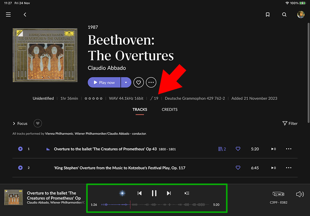 ยกตัวอย่างจากอัลบั้มชุด The Overtures ซึ่งเป็นอัลบั้มรวมงานประพันธ์แนวโอเวอเจอร์ (เพลงโหมโรง) ของ Ludwig Van Beethoven ของค่าย Deutsche Grammophon ชุดนี้ ในภาพข้างบนจะเห็นว่า โปรแกรม Roon ทำการวิเคราะห์ไดนามิกเร้นจ์ของเพลงในอัลบั้มนี้ด้วยมาตรฐาน R128 คือทำการวัด อัตราสวิงระหว่างจุดที่ เบาที่สุด” (softnest) ของเพลงในอัลบั้มนี้ไปถึงจุดที่ ดังที่สุด” (loudest) ของอัลบั้มนี้ ซึ่งได้ค่าความแตกต่างของความดังออกมาเท่ากับ 19 (ศรชี้สีแดง) ซึ่งถือว่าเป็นอัตราสวิงไดนามิกที่กว้างมาก (เพลงพ๊อพทั่วไปจะอยู่ในระดับไม่เกิน 10)