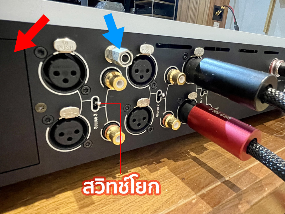 จากภาพด้านบน ตรงลูกศรสีแดงคือพื้นที่ที่ใช้ติดตั้งบอร์ดอ๊อปชั่น (ตัวที่ทดสอบนี้ไม่มีบอร์ดติดมา) ส่วนตำแหน่งที่ศรชี้สีฟ้าคือจุดเชื่อมต่อสายกราวนด์สำหรับโทนอาร์มของเครื่องเล่นแผ่นเสียง กรณีที่มีภาคโฟโนติดตั้งมาด้วย