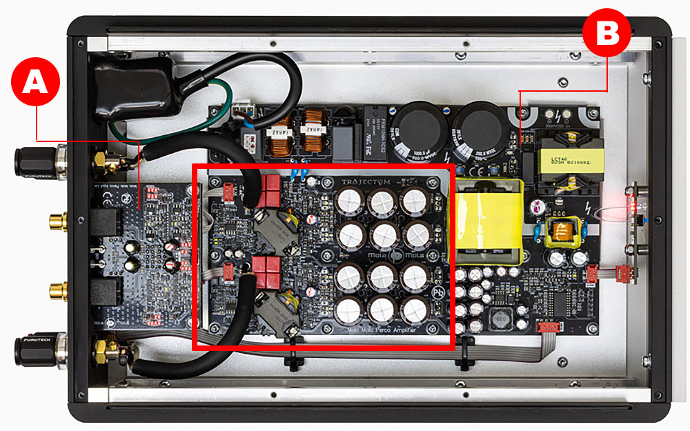 ไฮไล้ท์ของเพาเวอร์แอมป์ตัวนี้อยู่ที่โมดูลแอมป์ class-D ของค่าย Hypex Electronics (กรอบสีแดงในภาพข้างบน) ซึ่งเป็นบริษัทแม่ของแบรนด์ Mola Mola เป็นโมดูลของภาคขยายที่ทำงานด้วยโหมด class-D โดยใช้เทคโนโลยีพิิเศษที่ชื่อว่า NCORE® ที่คิดค้นโดย Bruno Putzeys เป็นหัวใจหลัก มีการปรับจูน oscillate และ feedback อย่างละเอียดเพื่อให้โมดูล NCORE® สามารถแสดงศักยภาพของมันออกมาได้อย่างเต็มที่มากที่สุด ประกอบกับภาคจ่ายไฟที่ออกแบบขึ้นมาเป็นพิเศษ (B) จนได้ออกมาเป็นแบบแผนเฉพาะตัวของแบรนด์ Mola Mola ที่ถูกตั้งชื่อเรียกไว้ว่า ‘Trajectum platformซึ่งนอกจากจะใช้ในการออกแบบเพาเวอร์แอมป์ Perca ตัวนี้แล้ว แบบแผน Trajectum platform ที่ว่านี้ยังได้ถูกใช้ในการออกแบบภาคขยายในตัวอินติเกรตแอมป์ของ Mola Mola รุ่น Kula ด้วย
