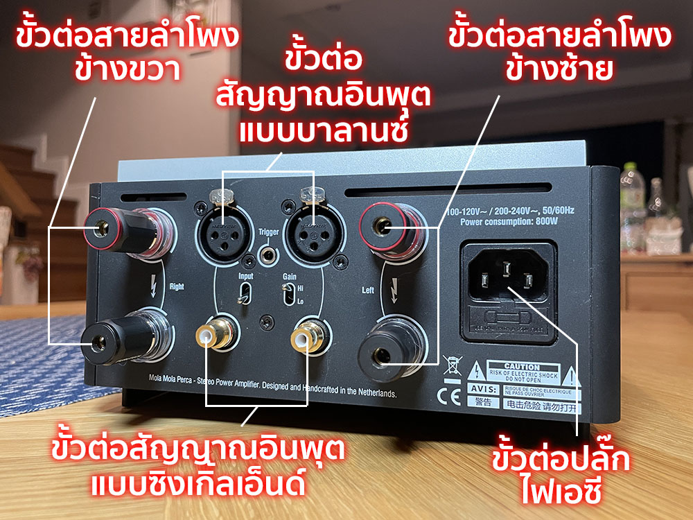 แม้ว่าตัวถังจะมีขนาดความกว้างแค่ครึ่งหนึ่งของเครื่องมาตรฐานทั่วไป แต่ผู้ผลิตเพาเวอร์แอมป์ Perca ตัวนี้ก็ยังคงให้ขั้วต่อสำหรับสัญญาณอินพุตและเอ๊าต์พุตมาครบๆ เหมือนเพาเวอร์แอมป์ขนาดมาตรฐานทั่วไป คือทางด้านอินพุตที่ส่งมาจากปรีแอมป์นั้น มีมาให้ใช้รองรับได้ครบทั้งสัญญาณบาลานซ์ผ่านขั้วต่อ XLR และสัญญาณซิงเกิ้ลเอ็นด์ผ่านขั้วต่อ RCA อย่างละหนึ่งชุด โดยมีสวิทช์โยกอันเล็กๆ ไว้โยกเลือกรูปแบบของอินพุตด้วย ส่วนทางด้านเอ๊าต์พุตนั้น ผู้ผลิตได้ติดตั้งขั้วต่อสายลำโพงมาให้ข้างละหนึ่งคู่แยกสำหรับแชนเนลซ้ายและแชนเนลขวา โดยใช้ขั้วต่อคุณภาพสูงของ Furutech ซะด้วย.!