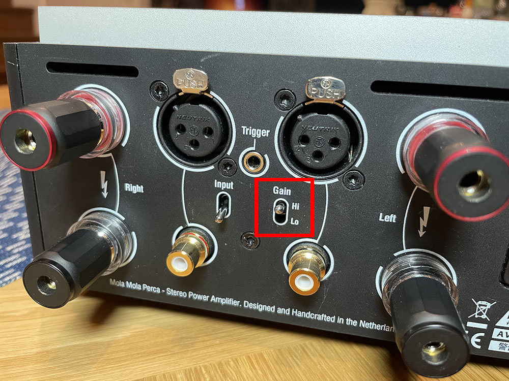ใต้ขั้วต่อสัญญาณอินพุต XLR แชนเนลซ้าย จะมีสวิทช์โยกเล็กๆ อันหนึ่งซึ่งมีไว้ให้ใช้สำหรับปรับโยกเพื่อเลือกอ๊อปชั่นของ gain ขยายตรงภาคอินพุตระหว่างตัว Perca ที่มีให้เลือก 2 ระดับคือ Hi (High = เกนขยายสูง) กับ Lo (Low = เกนขยายต่ำ) ถ้าโยกสวิทช์ไปที่ตำแหน่ง Lo (ดันสวิทช์ลง) เกนที่ภาคอินพุตของ Perca จะมีอัตราขยายอยู่ที่ 22dB แต่ถ้าโยกสวิทช์ไปที่ตำแหน่ง Hi (ดันสวิทช์ขึ้น) เกนที่ภาคอินพุตของ Perca จะมีอัตราขยายอยู่ที่ 28dB ซึ่งถือว่าเป็นความยืดหยุ่นที่ผู้ผลิตเพาเวอร์แอมป์ตัวนี้ใส่มาให้เพื่อให้สามารถแม็ทชิ่งกับปรีแอมป์ได้กว้างขึ้น