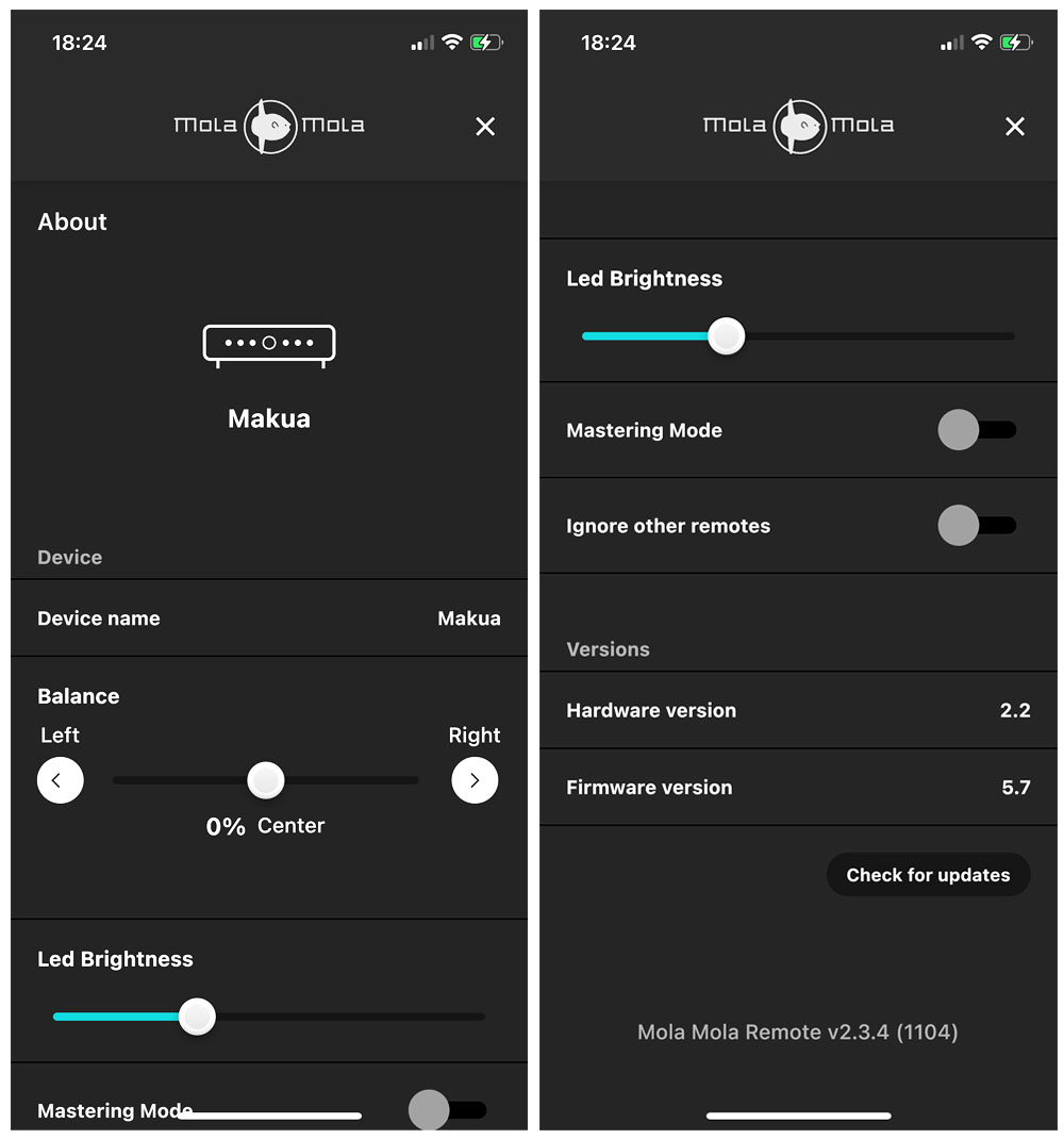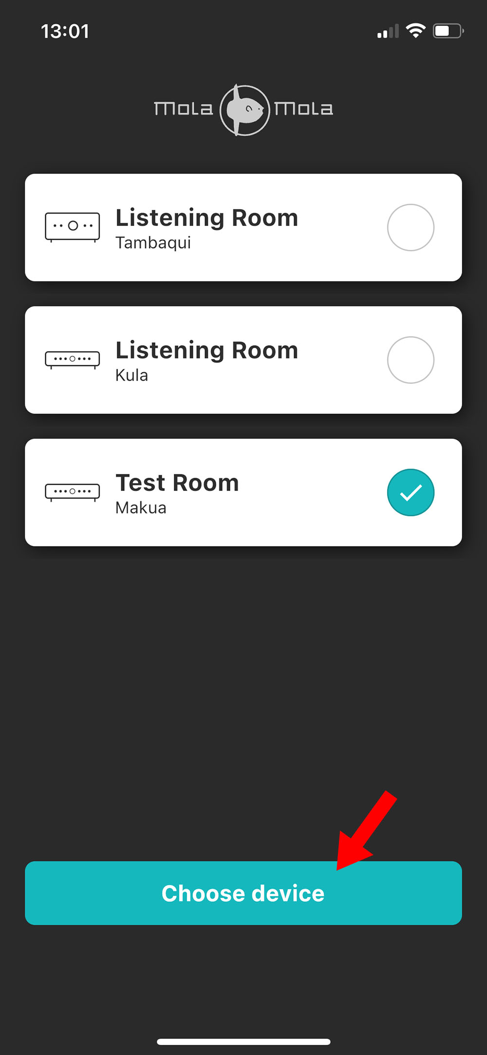 ทางผู้ผลิตได้ทำแอพลิเคชั่นที่ชื่อว่า ‘Mola Mola Remoteออกมาไว้ให้คุณใช้ในการปรับตั้งค่าต่างๆ บนตัว Makua ซึ่งแอพฯ ตัวนี้มีทั้งเวอร์ชั่น Android และ iOS เป็นแอพฯ ฟรี ภาพล่างคือหน้าแรกของแอพฯ นี้ ไม่ว่าคุณจะมีเครื่องเสียงของ Mola Mola อยู่กี่ตัว มันจะมาโผล่ให้เห็นอยู่ในหน้าแรกนี้ทั้งหมด รวมถึงเครื่องที่ไม่ได้มีอยู่แล้วแต่เคยใช้แอพฯ นี้ควบคุมมาก่อนมันก็จะโปล่ขึ้นมาด้วย อย่างที่เห็นในภาพ ตัว Tambaqui กับ Kula ซึ่งเป็น DAC กับอินติเกรตแอมป์ที่ผมเคยทดสอบไปแล้วใช้แอพฯ บน iPhone 12 เครื่องนี้ควบคุมมาก่อน กรณีนี้ เมื่อต้องการเข้าไปทำการปรับตั้งค่าในปรีแอมป์รุ่น Makua ก็ให้จิ้มลงไปที่วงกลมขาวๆ จนมีเครื่องหมายถูกขึ้นมาแบบในภาพ จากนั้นก็จิ้มไปที่ปุ่ม ‘Choose deviceด้านล่าง (ศรชี้)