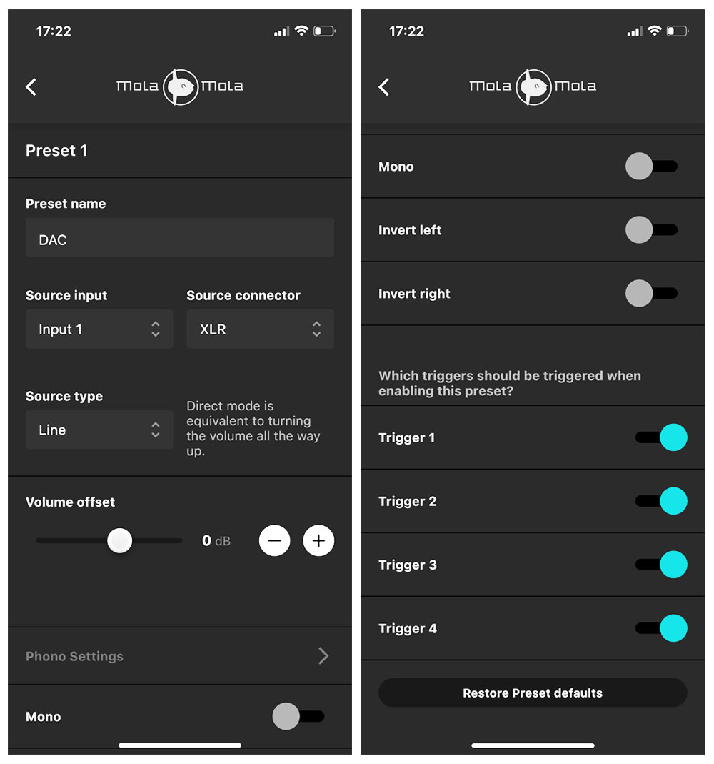 แอพฯ Mola Mola Remote จะเชื่อมต่อกับ Makua ผ่านทางคลื่น Bluetooth เมื่อแอพฯ กับ Makua เชื่อมต่อกันได้แล้ว หน้าตาของแอพฯ จะเปลี่ยนไปตามที่เห็นในภาพด้านบน ซึ่งในนั้นมีอะไรให้ใช้งานหลายอย่าง ตรงลูกศรชี้สีส้มนั้นคือคำสั่งปิดเครื่อง, ตรงลูกศรสีฟ้าคือคำสั่ง mute เสียง, ในกรอบสีเขียวนั้นเป็นคำสั่งในการเพิ่ม/ลดความดังของวอลลุ่ม, ในกรอบสีแดงคืออินพุตทั้ง 6 ที่มีไว้ให้เลือกใช้ คุณต้องการใช้งานและอยากจะปรับตั้งอินพุตไหนก็ให้จิ้มลงไปที่อินพุตนั้นจนมีเครื่องหมายถูกปรากฏขึ้นมาด้านหลังของอินพุตนั้น อย่างในภาพด้านบนคือเลือกที่จะปรับตั้งอินพุตที่ 1 ที่ชื่อว่า ‘DACหลังจากนั้นก็ให้จิ้มลงไปที่ปุ่ม Edit Preset 1’ (ลูกศรสีม่วง) เพื่อเข้าไปปรับตั้งค่าของอินพุต 1