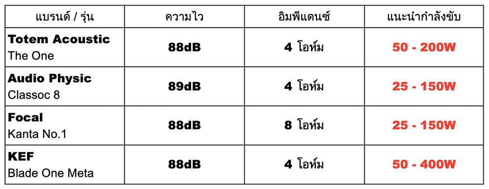 จากตัวเลขกำลังขับที่แนะนำ หรือ power recommended ของลำโพงทั้ง 4 คู่ ที่อยู่ในตารางข้างบนนั้น จะเห็นว่า กำลังขับของ Perca ตัวนี้อยู่ในระดับที่ เท่ากับระดับกำลังขับสูงสุดที่ผู้ผลิตลำโพง FocalKanta No.1แนะนำไว้ และเป็นตัวเลขกำลังขับที่อยู่ในระดับเท่ากับ 75% x กำลังขับสูงสุดที่ลำโพง KEFBlade One Meta’ (REVIEW) แนะนำไว้ ส่วนลำโพงอีกสองคู่คือ Totem AcousticThe Oneกับ Audio PhysicClassic 8’ (REVIEW) นั้น กำลังขับของ Perca สูงกว่ากำลังขับที่ลำโพงทั้งสองคู่นั้นแนะนำไว้เยอะเลย สรุปแล้ว กำลังขับของ Perca อยู่ในระดับที่พูดได้ว่า มากพอสำหรับขับลำโพง ส่วนใหญ่ที่มีอยู่ในตลาดได้หมด