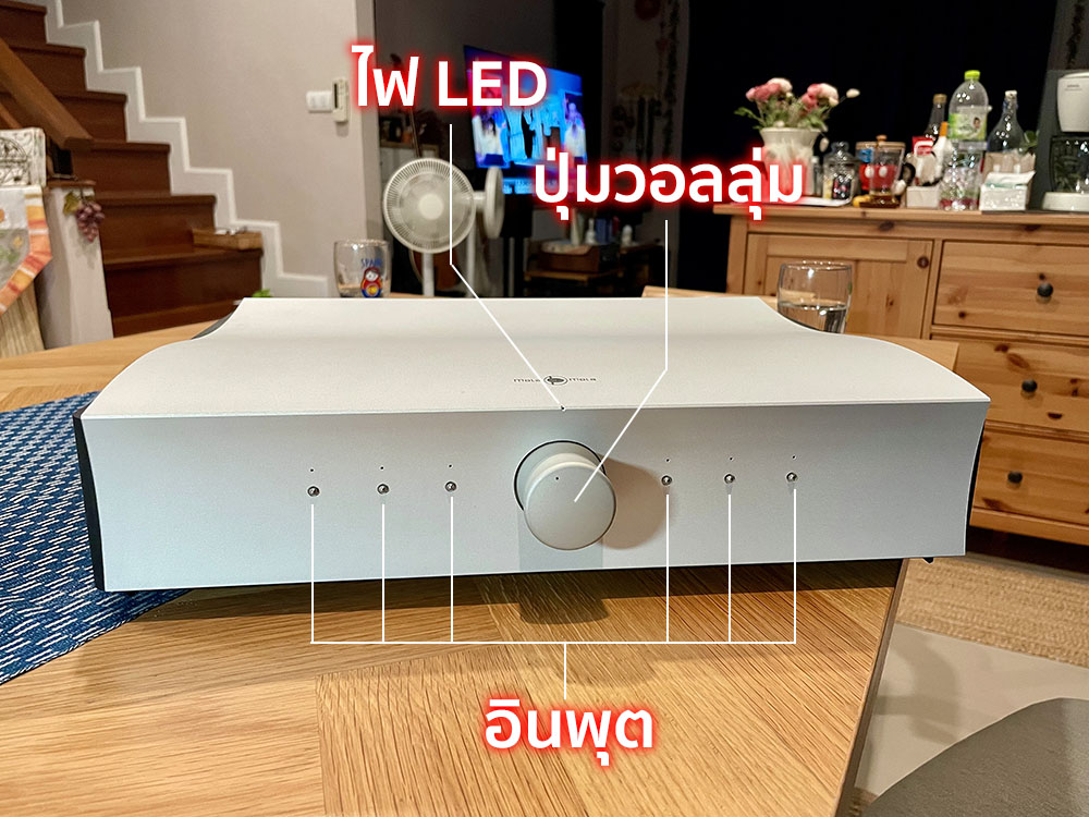 แผงหน้าของปรีแอมป์ตัวนี้ออกแบบได้เรียบง่ายสุดๆ เฟอร์นิเจอร์บนหน้าปัดที่เห็นก็มีแค่ปุ่มหมุนใหญ่ๆ หนึ่งปุ่ม กับปุ่มกดจิ๋วๆ อีก 6 ปุ่ม และมีไฟ LED ดวงเล็กจิ๋วอีกหนึ่งดวงเท่านั้นเอง.!