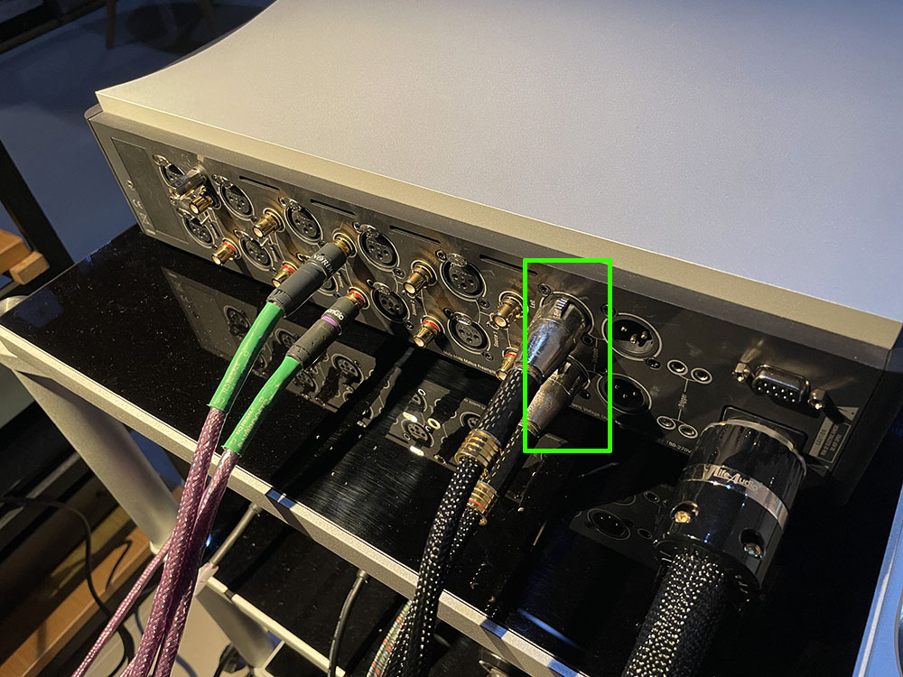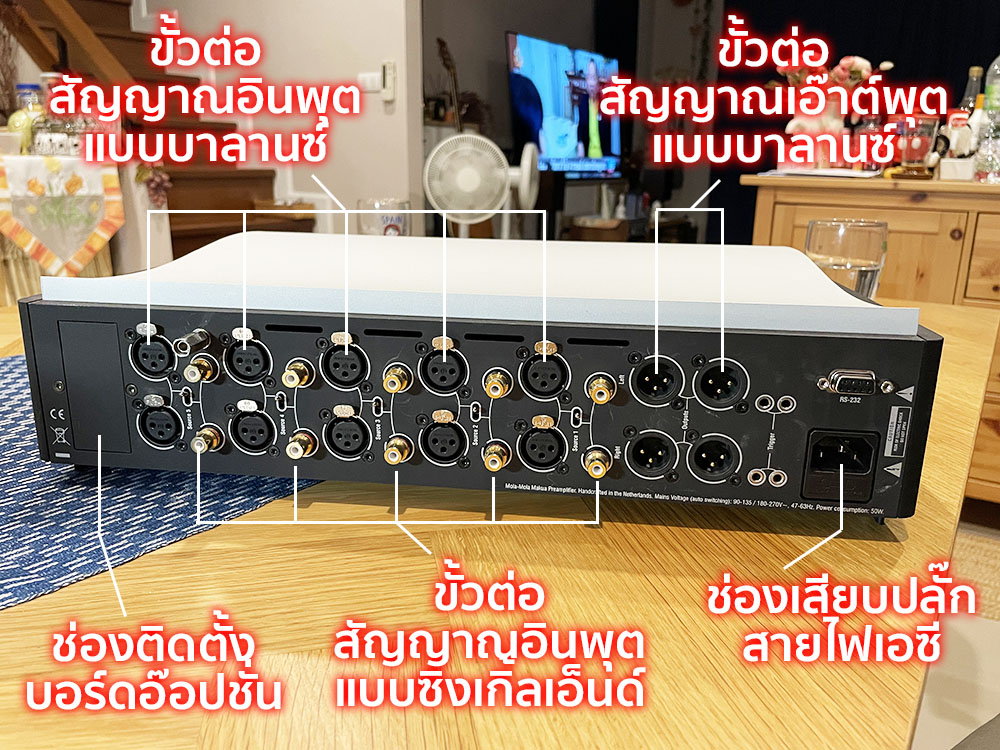 ที่แผงหลังของปรีแอมป์ตัวนี้แน่นมาก.! เต็มไปด้วยขั้วต่อเยอะแยะไปหมด แต่พอดูดีๆ แล้ว ขั้วต่อที่มีมาให้ก็เฉพาะที่จำเป็นทั้งนั้น ที่มากที่สุดก็คือ ขั้วต่อสำหรับสัญญาณอินพุต เนื่องจากผู้ออกแบบให้ขั้วต่อมาทั้ง 2 รูปแบบ คือ XLR สำหรับส่งผ่านสัญญาณบาลานซ์ 110 โอห์ม และขั้วต่อ RCA สำหรับส่งผ่านสัญญาณซิงเกิ้ลเอ็นด์ 75 โอห์ม เลยทำให้ดูเหมือนว่ามีขั้วต่อเยอะ แต่นับจำนวนขั้วต่อสัญญาณอินพุตที่ติดตั้งอยู่บนด้านหลังแล้ว นับได้แค่ 5 ช่องเท่านั้น แต่ทำไมบนแผงด้านหน้าถึงมีปุมกดเลือกอินพุต 6 ปุ่ม.? อีกปุ่มที่เขาเผื่อมาให้ใช้ในกรณีที่คุณเลือกอ๊อปชั่นเพิ่มบอร์ด DIGIN module ซึ่งเป็นโมดูลสำหรับภาค DAC นั่นเอง
