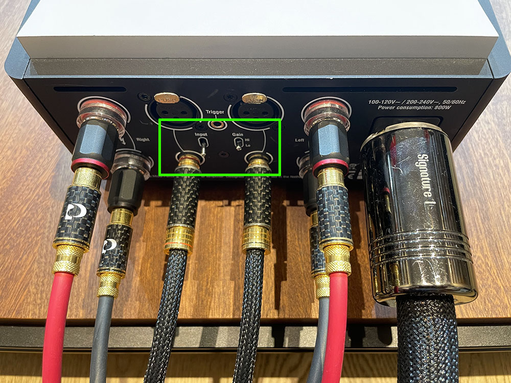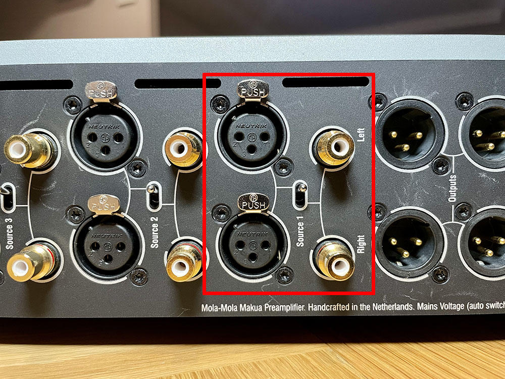ที่ช่องอินพุตแต่ละช่องนั้น แม้ว่าผู้ผลิตเขาจะติดตั้งขั้วต่อมาให้ทั้งสองรูปแบบในแต่ละอินพุต แต่คุณไม่สามารถใช้ได้พร้อมกันนะ ในการใช้งานจริงคุณต้องเลือกว่าจะทำการเชื่อมต่อสัญญาณจากแหล่งต้นทางของคุณมาที่ Makua ตัวนี้ผ่านเข้าทางขั้วต่อแบบไหน ซึ่งทางผู้ผลิตแนะนำไว้ว่า ถ้าอุปกรณ์ต้นทางของคุณให้เอ๊าต์พุตมาทั้ง 2 แบบ คือมีทั้ง XLR และ RCA มาให้เลือกใช้ เขาแนะนำให้เชื่อมต่อผ่านขั้วต่อ XLR จะให้คุณภาพเสียงดีกว่าเชื่อมต่อผ่านทางช่อง RCA และเมื่อทำการเสียบสายสัญญาณที่ใช้เชื่อมต่อทั้งสองฝั่งเสร็จแล้ว คุณต้องโยกสวิทช์เล็กๆ ที่มีตัวอักษรกำกับระบุช่องให้ตรงกับขั้วต่อที่คุณใช้เชื่อมต่อสัญญาณด้วย ในกรอบสีแดงที่ภาพข้างบนจะเห็นว่า ถ้าโยกสวิทช์ขึ้นด้านบนจะเป็นการเลือกเชื่อมต่อสัญญาณผ่านขั้วต่อ XLR แต่ถ้าดันลงล่างจะเป็นการเลือกเชื่อมต่อสัญญาณผ่านขั้วต่อ RCA นั่นเอง
