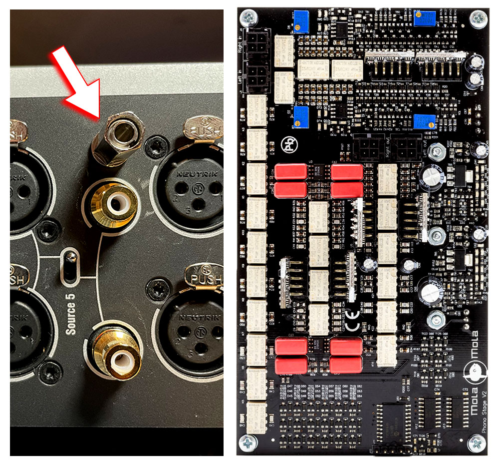 ผู้ผลิตปรีแอมป์ตัวนี้เขาเผื่ออ๊อปชั่นเอาไว้ให้คุณสามารถอัพเกรดเพิ่มเติมภาคขยายหัวเข็มได้ โดยติดตั้งขั้วต่อสายกราวนด์สำหรับเครื่องเล่นแผ่นเสียงมาให้ (ศรชี้ภาพบน / ด้านขวาคือลักษณะของบอร์ดโฟโน) เผื่อไว้กรณีที่คุณต่อสัญญาณจากเครื่องเล่นแผ่นเสียงที่มาอินพุตใดอินพุตหนึ่งที่คุณใช้สำหรับรองรับสัญญาณจากเครื่องเล่นแผ่นเสียงเข้ามาที่บอร์ด Phono ที่คุณเพิ่มเติมเข้าในข้างในแล้วมันเกิดปัญหากราวนด์ลู๊ปขึ้น (*คุณสามารถกำหนดให้อินพุตใดเป็นอินพุตสำหรับภาคโฟโนก็ได้)