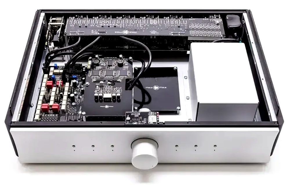 ทีมออกแบบของ Mola Mola กล่าวอ้างว่า พวกเขารู้วิธีในการออกแบบเครื่องเสียงให้มีความ เรียบง่ายโดยไม่จำเป็นต้องลดจำนวนอุปกรณ์ภายในให้มีแค่ไม่กี่ชิ้นเพื่อสะท้อนความหมายของคำว่าเรียบง่าย ฟังแล้วงงมั้ยครับ.? เหตุผลก็เพราะว่า ทีมงานออกแบบของ Mola Mola มีมุมมองกับคำว่า เรียบง่ายที่ต่างไปจากคนอื่น กล่าวคือ ที่ผ่านๆ มานั้น ถ้ามีผู้ผลิตเจ้าไหนกล่าวอ้างว่าเครื่องเสียงของพวกเขามีดีไซน์ที่เน้นความเรียบง่าย หรือใช้คำว่า ‘minimal designถ้าเปิดฝาเครื่องออกมาดูจะพบว่าภายในตัวเครื่องมีอุปกรณ์น้อยชิ้น มีการทำงานของวงจรที่ไม่ซับซ้อน นั่นคือความหมายของคำว่า เรียบง่ายสำหรับผู้ผลิตรายอื่น ทว่า สำหรับ Mola Mola แล้ว คำว่าเรียบง่ายของพวกเขาหมายถึงความพยายามที่ทำให้ภาคขยาย (gain stage) มีความสะอาดใสมากที่สุด โดยอาศัยการจับคู่ในการเชื่อมต่อระหว่างสัญญาณขาเข้ากับวงจรขยาย gain stage แบบ 1:1 คือทีละอินพุต ไม่ได้ต่อทุกอินพุตพ่วงเข้าไปกับวงจรขยายทั้งหมด เพื่อลดการรบกวนข้ามช่องที่เรียกว่า crosstalk มีผลให้สัญญาณอินพุตแต่ละอินพุตที่เลือกใช้จะผ่านการขยายด้วยภาค gain stage ตรงๆ จึงมีความใส (transparent) และ noise ต่ำ เมื่อบวกกับการใช้วอลลุ่มแบบ relay ควบคุม gain ของภาคเอ๊าต์พุตโดยตรง ซึ่งให้ผลลัพธ์ดีกว่าการใช้วอลลุ่มแบบตัวต้านทานที่ลดความดังเป็นขั้น เป็นผลดีต่อไดนามิกเร้นจ์และความราบเรียบของสัญญาณ นอกจากนั้น ยังมีการใช้โปรเซสเซอร์เข้ามาควบคุมการปรับตั้งค่าต่างๆ ของแต่ละอินพุตผ่านทางช่อง RS232 หรือจะปรับตั้งด้วยแอพลิเคชั่นผ่านเข้าทาง Bluetooth ก็ได้ เป็นการเพิ่มความสะดวกให้กับผู้ใช้มากขึ้น