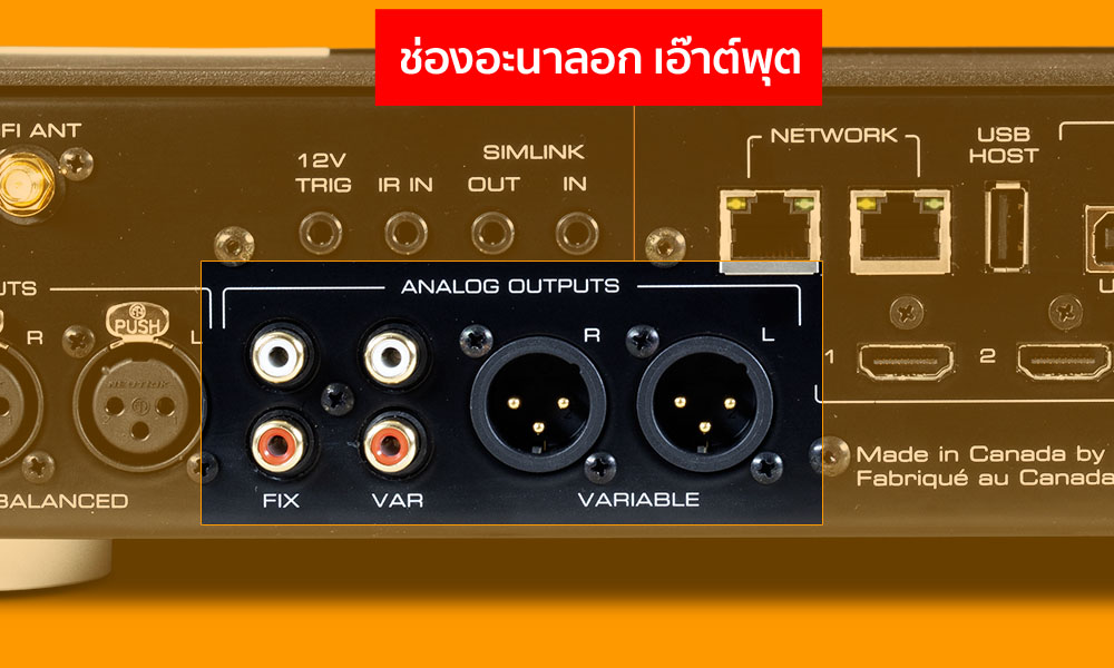 Moon 390 มีช่องอะนาลอก เอ๊าต์พุตมาให้เลือกใช้ 3 ช่อง แยกเป็นสัญญาณเอ๊าต์พุตแบบ Variable output จำนวน 2 ช่อง ผ่านขั้วต่อ RCA และ XLR อย่างละช่อง กับแบบ Fixed output จำนวน 1 ช่อง ผ่านขั้วต่อ RCA ในกรณีที่ต้องการใช้งาน Moon 390 เป็น external DAC เพื่อต่อเข้าอินติเกรตแอมป์หรือปรีแอมป์ที่มีวอลลุ่มของตัวเอง แนะนำให้เลือกเอ๊าต์พุต Fixed เพื่อหลีกเลี่ยงปัญหาวอลลุ่มซ้อนวอลลุ่มซึ่งจะทำให้เสียงไม่ดี แต่ถ้าต้องการใช้ Moon 390 ในโหมดของปรีแอมป์ด้วย ทางผู้ผลิตแนะนำให้ใช้เอ๊าต์พุต XLR ซึ่งเป็นช่องทางที่ให้ประสิทธิภาพเสียงดีที่สุด แต่ในการใช้งานจริง แนะนำให้เช็คดูก่อนว่า เพาเวอร์แอมป์ที่เอามาต่อเชื่อมกับ Moon 390 ดีไซน์ภาคอินพุตเป็นบาลานซ์แท้หรือเปล่า.? ถ้าเพาเวอร์แอมป์มีช่องอินพุต XLR มาให้ แต่คุณไม่แน่ใจว่าภาคอินพุตของมันเป็นบาลานซ์แท้หรือเทียม แนะนำให้ลองฟังด้วยการเสียบใช้งานทางช่องบาลานซ์เทียบกับช่องอันบาลานซ์ แบบไหนให้เสียงออกมาดีกว่าก็เลือกเชื่อมต่อทางช่องนั้น อย่าลืมว่า คุณภาพของสายสัญญาณก็มีส่วนมากกับคุณภาพเสียงที่ได้ออกมา
