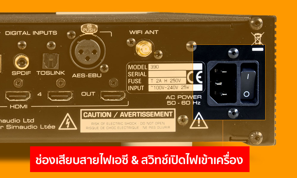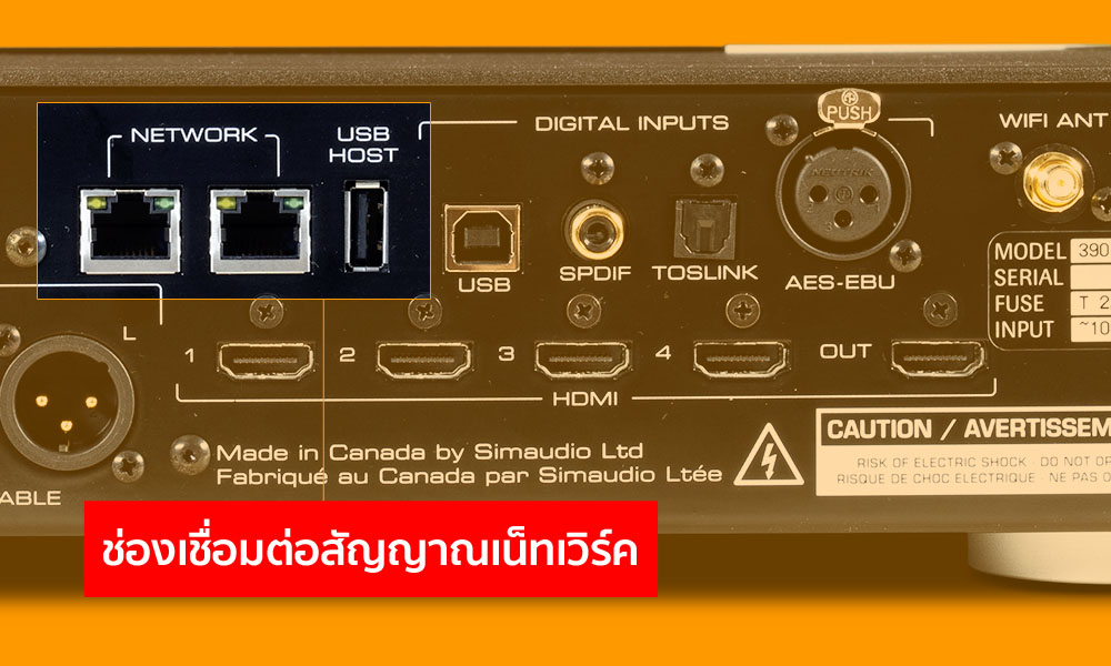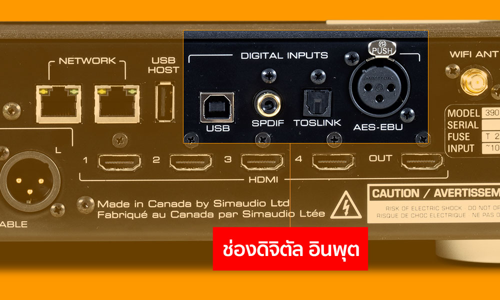 ที่นี้มาดูทางด้านอินพุตสำหรับสัญญาณดิจิตัลกันบ้าง ซึ่ง 390 จัดวางช่องดิจิตัล อินพุตแยกกันไว้เป็นกลุ่ม เริ่มจาก USB ซึ่งเป็นช่องอินพุตที่ Moon ตั้งใจออกแบบมาให้เป็นที่สุดของการเชื่อมต่อ คู่กับช่อง Network (Ethernet) โดยจัดให้มีความสามารถในการรองรับสัญญาณได้สูงที่สุดเมื่อเทียบกับช่องดิจิตัล อินพุตอื่นๆ คือรองรับสัญญาณ PCM ได้ตั้งแต่แซมปลิ้งเรต 44.1kHz ขึ้นไปจนถึงระดับสูงสุดคือ 384kHz ทั้งที่เป็นสัญญาณ PCM ตรงๆ และที่ผ่านการเข้ารหัสมาด้วยฟอร์แม็ต MQA และสามารถรองรับสัญญาณ DSD ได้ตั้งแต่ระดับเริ่มต้นคือ DSD64 (2.8224MHz) ไปจนถึงระดับสูงสุดที่ DSD256 (11.289MHz)