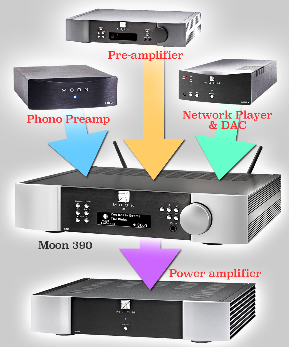 ที่ถูกที่ควรแล้ว ต้องเรียก Moon 390 ตัวนี้ว่าเป็นผลิตภัณฑ์ระดับ “revolution” คือผลิตภัณฑ์แคตากอรี่ใหม่ที่ออกมาปฏิวัติวงการอย่างแท้จริง โดยรวมเอาการทำงานในส่วนของ analog pre-amplifier จากรุ่น 350p กับ external DAC ซึ่งเป็น digital source จากรุ่น 380D เข้ามาผนวกรวมไว้ในเครื่องเดียวกันแล้วเพิ่มอินพุต analog กับโมดูลเน็ทเวิร์ค มิวสิค สตรีีมเมอร์ “MiND” เข้าไป ทำให้ Moon 390 ตัวนี้มี “ทุกอย่าง” ครบในตัวเดียว