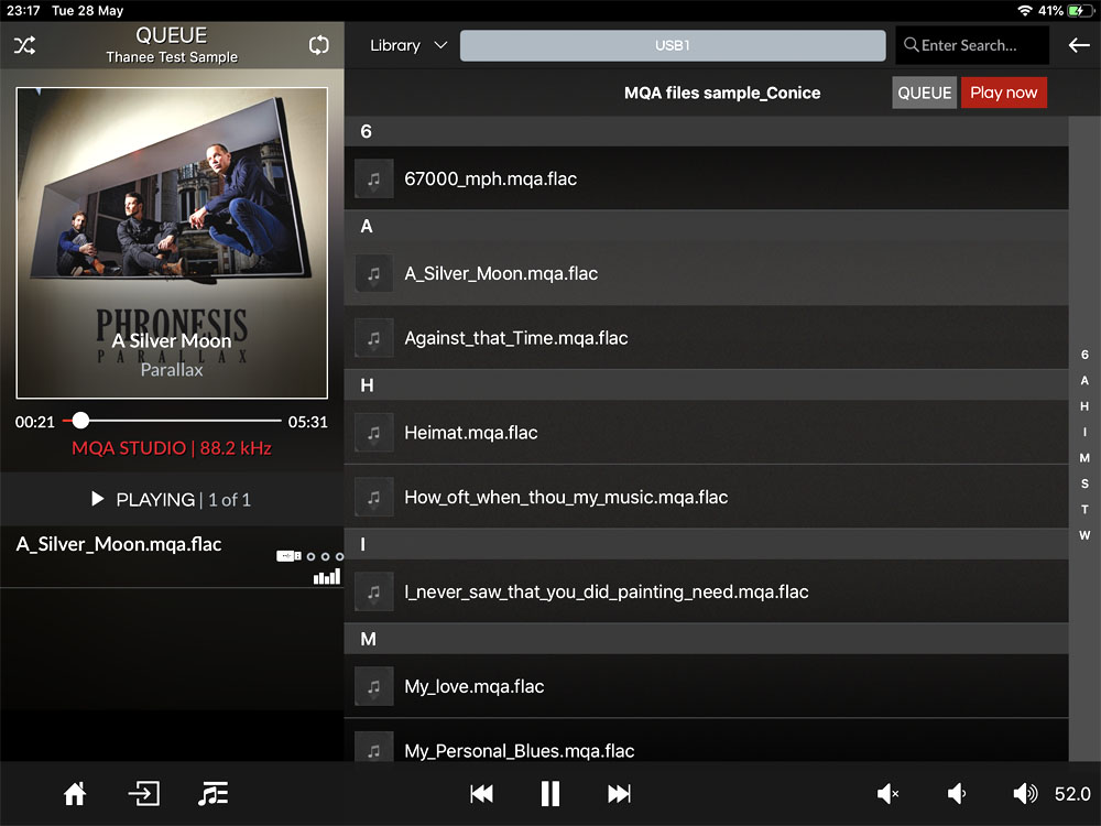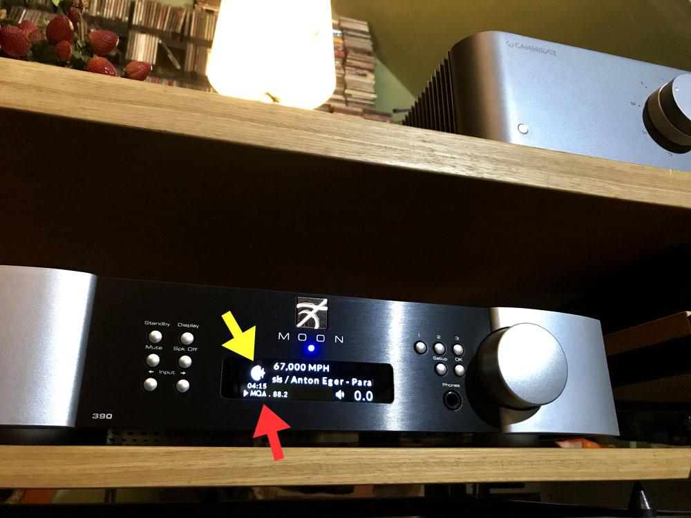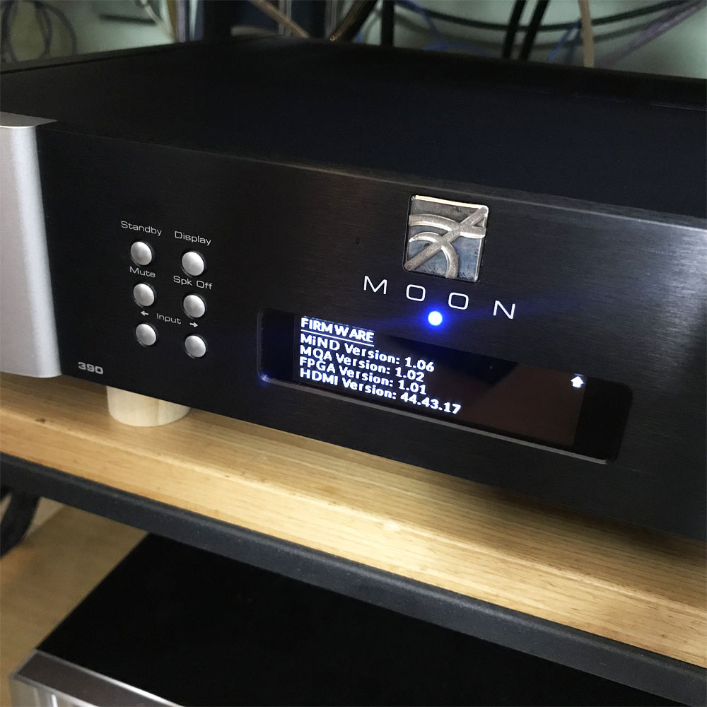 และที่เจ๋งมากก็คือว่า Moon 390 รองรับการเล่นไฟล์ MQA ได้ด้วย สามารถคลี่ MQA ออกมาได้สุดทาง ตามที่บันทึกมาจากสตูดิโอ ให้เสียงออกมาดีมาก ซึ่งคุณมีทางเลือกในการเล่นไฟล์ MQA กับ Moon 390 ได้ 2 ทางขึ้นอยู่กับว่าสัญญาณ MQA นั้นมาจากไหน คือก่อนอื่นต้องทำความเข้าใจก่อนว่า การที่คุณจะได้มาซึ่งไฟล์เพลงที่เข้ารหัสด้วย MQA มีอยู่ 2 แหล่ง แหล่งแรกคือ ได้มาจากการสตรีมมาจากเซอร์ฟเวอร์ของ TIDAL กับอีกแหล่งคือจากแผ่น MQA-CD ในกรณีนำมาเล่นผ่าน Moon 390 ถ้าเป็นไฟล์ที่สตรีมมาจาก TIDAL คุณก็ต้องใช้แอพฯ MiND ในการสตรีม (ต้องสมัครเสียเงินค่าสมาชิกรายเดือนให้กับ TIDAL ก่อน) แต่ถ้าคุณซื้อแผ่น MQA-CD มาเล่นกับ Moon 390 คุณต้องนำแผ่น MQA-CD ไปเล่นบนเครื่องเล่นแผ่นที่ปล่อยสัญญาณ PCM ผ่านออกมาทางช่อง SPDIF (coaxial หรือ optical) แล้วใช้สายดิจิตัล (coaxial หรือ optical) เชื่อมต่อระหว่างเอ๊าต์พุตของเครื่องเล่นแผ่นกับอินพุต SPDIF ของ Moon 390 ซึ่งจะทำให้ Moon 390 สามารถถอดรหัส MQA ออกมาได้