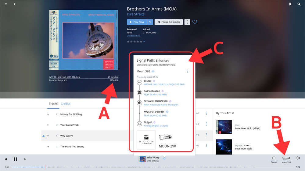 แต่ถ้าคุณริปแผ่น MQA-CD ออกมาเป็นไฟล์ แล้วจะเอาไฟล์นั้นมาเล่นกับ Moon 390 เพื่อให้ Moon 390 ถอดรหัส MQA ให้ กรณีนี้ คุณต้องนำไฟล์ MQA นั้นไปเล่นด้วยโปรแกรม roon แล้วส่งสัญญาณมาที่ Moon 390 (B) โดยเข้าทางอินพุต USB หรือทางอินพุต Network ก็ได้ ในภาพด้านบน ผมริปแผ่น MQA-CD ออกมาเป็นไฟล์ WAV (A) แล้วเล่นด้วย roon บนคอมพิวเตอร์ Mac mini ส่งสัญญาณมาที่ Moon 390 ผ่านเข้าทางอินพุต Network ของ Moon 390 ซึ่ง Moon 390 สามารถคลี่ MQA ของอัลบั้มนี้ออกมาได้สุดซอยคือไปถึง 352.8kHz เต็มๆ !!! (C) เสียงออกมาดีกว่าฟังจากแผ่นซีดีเยอะมากๆ สาเหตุที่ Moon 390 ทำอะไรแบบนี้ได้ก็เพราะว่า Moon 390 มีคุณสมบัติเป็น Roon Ready นั่นเอง (ต้องการดูข้อมูล Roon Ready เพิ่มเติม คลิ๊กเลย!)