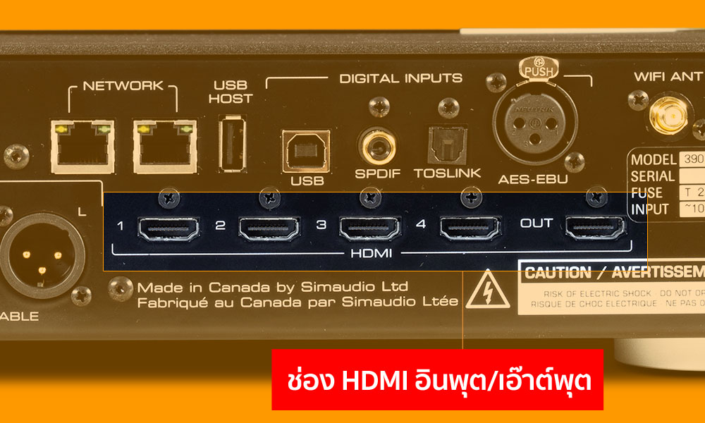 ช่องอินพุตที่พิเศษมากๆ สำหรับ Moon 390 ก็คือช่องอินพุต HDMI ซึ่งไม่ค่อยจะพบเห็นในอุปกรณ์เครื่องเสียงประเภท external DAC ตัวไหนๆ เลย และให้มาเยอะมากด้วย คืออินพุต 4 ช่อง + เอ๊าต์พุต 1 ช่อง ซึ่งช่อง HDMI Out นั้นคุณสามารถนำไปเชื่อมต่อกับช่อง HDMI ARC ของทีวีได้ เพื่อดึงสัญญาณเสียงจากทีวีเข้ามาผ่าน Moon 390 เพื่อส่งต่อไปขยายที่เพาเวอร์แอมป์และส่งออกลำโพงได้ ใครที่อยากได้แอมป์ขยายเสียงจากทีวีให้มีคุณภาพสูงขึ้น แต่ไม่ได้ต้องการระบบเสียงเซอร์ราวนด์ อ๊อปชั่นนี้ของ Moon 390 ตรงวัตถุประสงค์ของคุณมากที่สุด