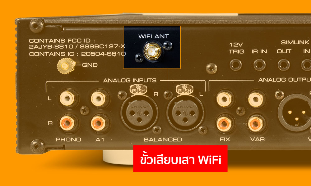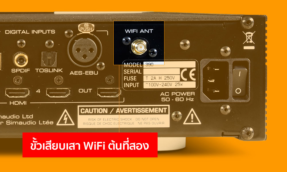 ถ้าคุณไม่สามารถเดินสาย LAN มาที่ 390 ได้ ถ้าจะใช้อินพุต Network หรือ AirPlay ก็จำเป็นต้องเชื่อมต่อด้วยคลื่น Wi-Fi ไร้สายด้วยการเสียบเสาอากาศ 2 ต้นเข้าที่จุดเชื่อมด้านซ้าย (ภาพบน) และจุดเชื่อมด้านขวา (ภาพล่าง) ซึ่งทำให้สามารถอาศัยคลื่น Wi-Fi ในการรับ/ส่งคำสั่งกับสัญญาณเสียงได้ แต่ประสิทธิภาพในการรับ/ส่งจะด้อยกว่าแบบใช้สาย โดยเฉพาะการรับ/ส่งสัญญาณที่มีแซมปลิ้งเรตสูงๆ อย่าง 352.8kHz, 384kHz และ DSD128 กับ DSD256 จะไม่ไหว ความแรงและความเสถียรของคลื่น Wi-Fi ในบ้านของคุณก็มีผลกับการรับ/ส่งสัญญาณด้วยวิธีไร้สายเช่นกัน ดังนั้น ถ้าเน้นประสิทธิภาพในการทำงาน และเน้นคุณภาพเสียงที่ดี แนะนำให้เชื่อมต่อด้วยวิธีใช้สายผ่านทางช่อง Ethernet จะให้ผลลัพธ์ดีกว่ามาก