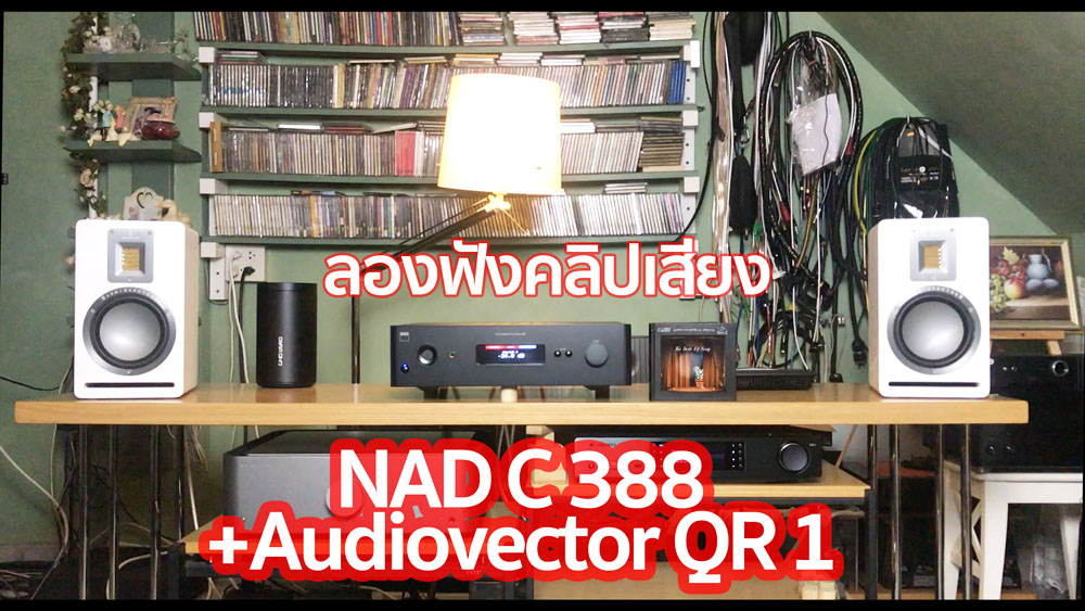 คู่ที่สามที่ผมทดลองจับคู่กับ C 388 เป็นลำโพงที่มีราคาระหว่าง 30,000 – 40,000 บาทต่อคู่ (ตอบสนองความถี่ 45Hz – 45kHz / อิมพีแดนซ์ 4-8 โอห์ม) ซึ่งได้ผลลัพธ์ออกมาดีมาก นั่นคือจับกับลำโพงวางหิ้งของ Audiovector รุ่น QR 1 ซึ่งตัวเลขกำลังขับที่รองรับได้สูงสุดระบุไว้ในสเปคฯ อยู่ที่ 150W ที่ 4-8 โอห์ม ตรงกับกำลังขับสูงสุดที่ C 388 มีอยู่ในตัวพอดี คู่นี้ให้เสียงที่เปิด โปร่ง เวทีเสียงทั้งแผ่กว้างและถอยลึกลงไปด้านหลังระนาบลำโพงอย่างเป็นอิสระ ไดนามิกสวิงเต็ม หัวเสียงอิมแพ็คมีน้ำหนักย้ำเน้นที่ชัดเจน จังหวะดนตรีนิ่งอย่างมีเสถียรภาพทั้งเพลงช้าและเพลงเร็ว ไม่ปรากฏว่ามีอาการเฉื่อยหรือเร่งจนเกินไป รายละเอียดจะแจ้งทั้งทุ้ม, กลาง และแหลม เนื้อเสียงเนียนละเอียด รู้สึกได้ว่า กำลังขับของแอมป์มันควบคุมการทำงานของไดอะแฟรมได้อยู่หมัดทุกขณะจิต เสียงทุกเสียงในเพลงหลุดกระจายออกไปลอยอยู่ในอากาศอย่างเป็นอิสระ ขยับเคลื่อนตัวได้อย่างปลอดโปร่ง ฟังเพลงช้าก็ได้อารมณ์ เพลงเร็วก็ได้ความสนุก