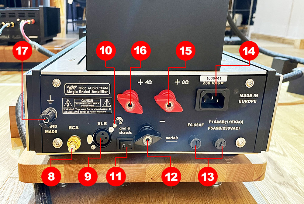 ถัดไปก็เป็นสวิทช์เชื่อมกราวนด์ของสัญญาณอินพุตเพื่อถ่ายลงตัวถังเครื่อง (11) ถ้ามีเสียงฮัมหรือจี่เกิดขึ้นในระบบ ให้ทดลองกดสวิทช์นี้ดูอาจจะแก้ปัญหาได้ ตรงขั้วต่อสายลำโพงจะมีขั้วต่อเฟสบวก (สีแดง) ให้เลือกอยู่ 2 ขั้วต่อ คือ 8 โอห์ม (15) กับ 4 โอห์ม (16) ซึ่งในการใช้งานให้ดูจากสเปคฯ อิมพีแดนซ์ของลำโพงว่าเป็น 4 หรือ 8 โอห์ม ก็ให้เชื่อมสายลำโพงไปตามนั้น และทางผู้ผลิตมีย้ำเตือนไว้ว่า “ห้าม – ต่อเชื่อมที่ขั้วต่อ 4 และ 8 โอห์มพร้อมกัน”
