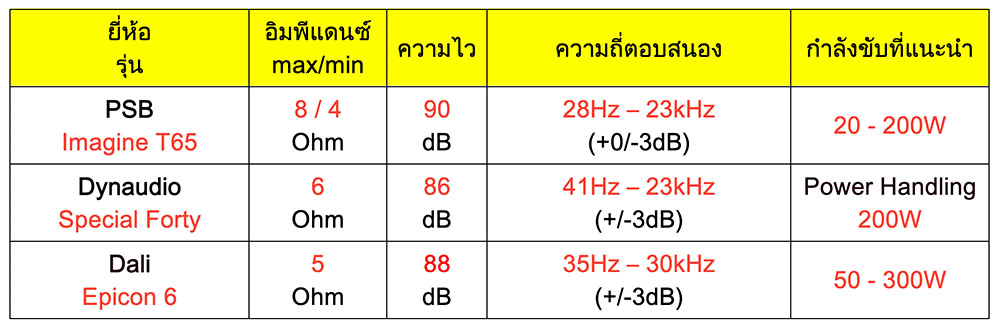 ส่วนลำโพงที่ใช้ทดสอบปรี+เพาเวอร์ฯ คู่นี้มีทั้งหมด 3 คู่ ด้วยกัน เรียงลำดับตามราคา ตารางข้างบนนี้แสดงคุณสมบัติบางส่วนของลำโพงทั้งสามคู่นี้ซึ่งสามารถใช้วิเคราะห์ประเมินสำหรับการแม็ทชิ่งกับปรี+เพาเวอร์ฯ NAT Audio ได้คร่าวๆ คู่แรกที่ผมใช้ทดลองฟังกับปรี+เพาเวอร์หลอดคู่นี้ เป็นลำโพงตั้งพื้นขนาดกลางยี่ห้อ PSB รุ่น Imagine T65 (REVIEW) ราคาคู่ละเกือบแปดหมื่นบาท มีความไวสูงถึง 90dB คู่ที่สองเป็นลำโพงสองทางวางบนขาตั้งของยี่ห้อ Dynaudio รุ่น Special Forty ราคาประมาณแสนกลางๆ ส่วนคู่ที่สามที่ผมใช้ปิดท้ายการฟังทดสอบปรี+เพาเวอร์หลอดคู่นี้ เป็นลำโพงตั้งพื้นขนาดกลาง ยี่ห้อ Dali รุ่น Epicon 6 ราคาประมาณสี่แสนกลางๆ ต่อคู่