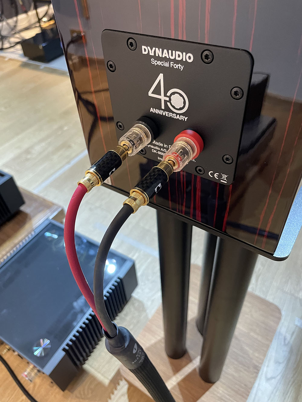 ในภาพข้างบนแสดงตัวอย่างในการเชื่อมต่อสายลำโพงจากเพาเวอร์แอมป์เข้ากับลำโพง Dynaudio ‘Special Forty’ จะเห็นว่า สายลำโพงขั้ว – (เส้นสีดำ) กับสายลำโพงขั้ว + (เส้นสีแดง) ต่อไขว้สลับกัน เป็นการแก้มุมเฟสจากเอ๊าต์พุตของปรีแอมป์ Magnetic ให้กลับมาเป็นเฟสปกติก่อนเข้าไปที่ลำโพง