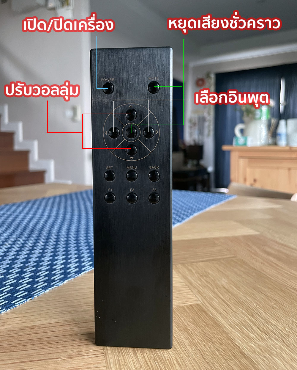 1 = ปุ่มกดสำหรับเปิด/ปิดเครื่อง และกดเพื่อหยุดเสียงชั่วคราว (mute)