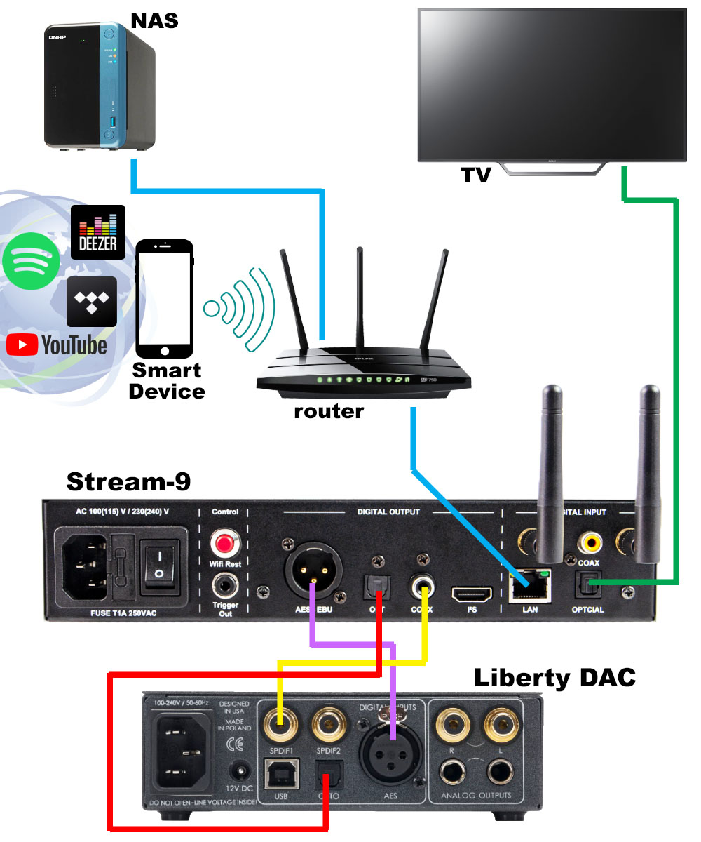 ผมนำ Stream-9 มาเซ็ตอัพในห้องรับแขกที่บ้านของผมซึ่งมีขนาดพื้นที่ กว้าง 3.8 ม. x ลึก 7.3 ม. โดยนั่งฟังในแนวกว้างของห้อง ลักษณะการเชื่อมต่อระบบก็ตามชาร์ตด้านบนนี้ คือในส่วนของอินพุต ผมเชื่อมต่อที่อินพุต Optical ด้วยสัญญาณจากทีวี Sony OLED Bravia A9F และเชื่อมต่ออินพุต Ethernet เข้ากับ router ที่บ้านของผมเพื่อดึงไฟล์เพลงที่ผมเก็บอยู่ใน NAS ซึ่งเชื่อมต่ออยู่กับ router ออกมาฟัง และผมใส่เสารับคลื่น Bluetooth กับเสารับคลื่น Wi-Fi ไว้ที่ด้านหลังของ Stream-9 เพื่อทดสอบการสตรีมไฟล์เพลงแบบไร้สายด้วย Bluetooth กับ AirPlay จากสมาร์ทโฟนผ่านเข้ามาที่ Stream-9 ด้วย
