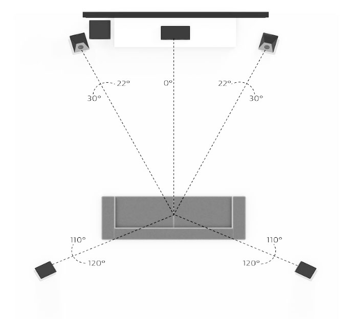 การเซ็ตอัพลำโพงทั้ง 5 ตัวสำหรับฟังเพลงด้วยระบบเสียงมัลติแชนเนล ผมยึดตามแพลทเทิ้นของ Dolby Labs. ที่กำหนดไว้สำหรับระบบเสียง 5.1 ch ตามภาพนี้