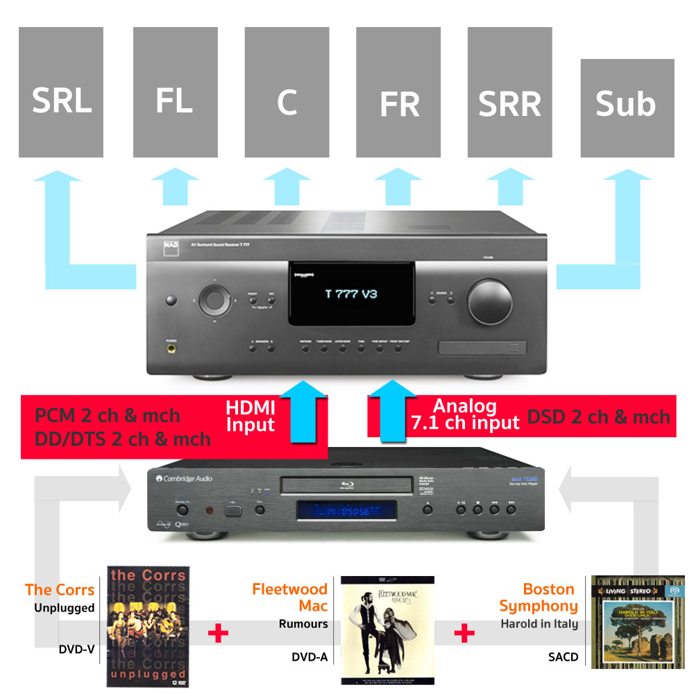 ระหว่าง Azur 751BD กับ T777v3 ผมทำการเชื่อมต่อสัญญาณไว้ทั้งสองระบบคือ digital โดยอาศัยสาย HDMI สำหรับการเล่นแผ่น DVD-Video กับแผ่น DVD-Audio ส่วนตอนเล่นแผ่น SACD ผมใช้วิธีส่งผ่านสัญญาณ analog จากตัว Azur 751BD ไปที่ T777v3 ด้วยสายสัญญาณอะนาลอก 5 เส้น เพราะภาค DAC ในตัว T777v3 ไม่รองรับ DSD โดยตรง จึงให้ Azur 751BD ทำหน้าที่แปลงให้จากต้นทาง