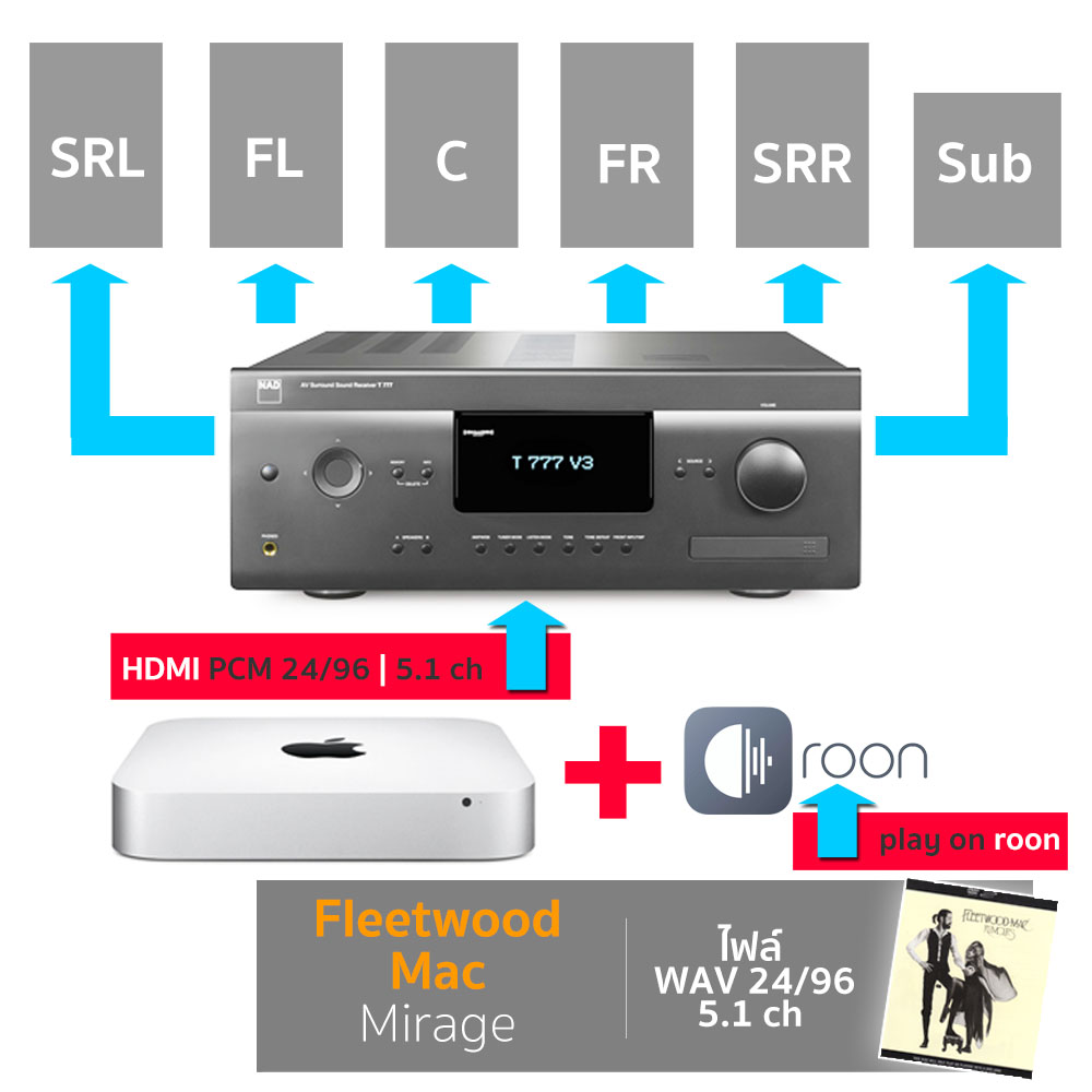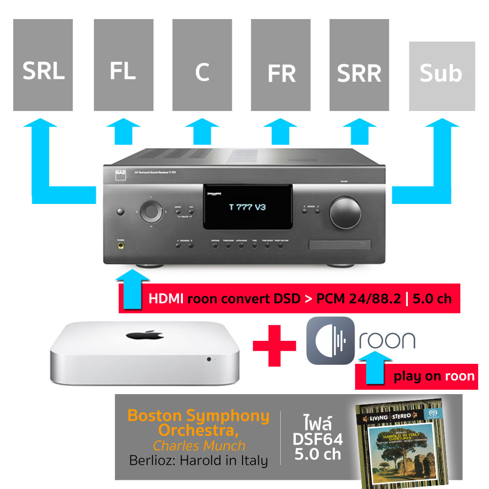 ผมนำไฟล์ DSF64 (DSD) และ WAV (PCM) ระบบเสียงมัลติแชนเนลที่มีอยู่มาลองเล่นด้วยโปรแกรม roon บนแมคมินิ แล้วส่งออกไปที่ T777v3 ผ่านทางช่อง HDMI ของ Mac mini