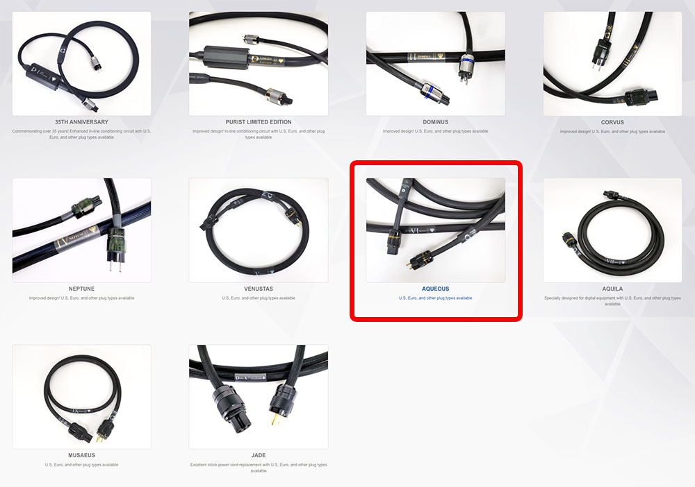 พวกเขาแยกผลิตภัณฑ์ของพวกเขาออกมาเป็นหลายซีรี่ย์ แต่ละซีรี่ย์ก็มีสายเชื่อมต่ออยู่ครบทุกประเภทใช้งาน อย่างเช่น สายไฟเอซีที่ผมนำมาทดสอบครั้งนี้จัดอยู่ในซีรีย์ AQUEOUS (ในกรอบสีแดง) ซึ่งอยู่ใน ลำดับที่ 4 เมื่อไล่จากซีรี่ย์เล็กสุดคือ JADE ขึ้นมา ซึ่งในซีรี่ย์ AQUEOUS นี้นอกจากสายไฟเอซีตัวนี้แล้ว ยังมีสายสัญญาณ, สายลำโพง, สายดิจิตัล และสายโฟโน ด้วย