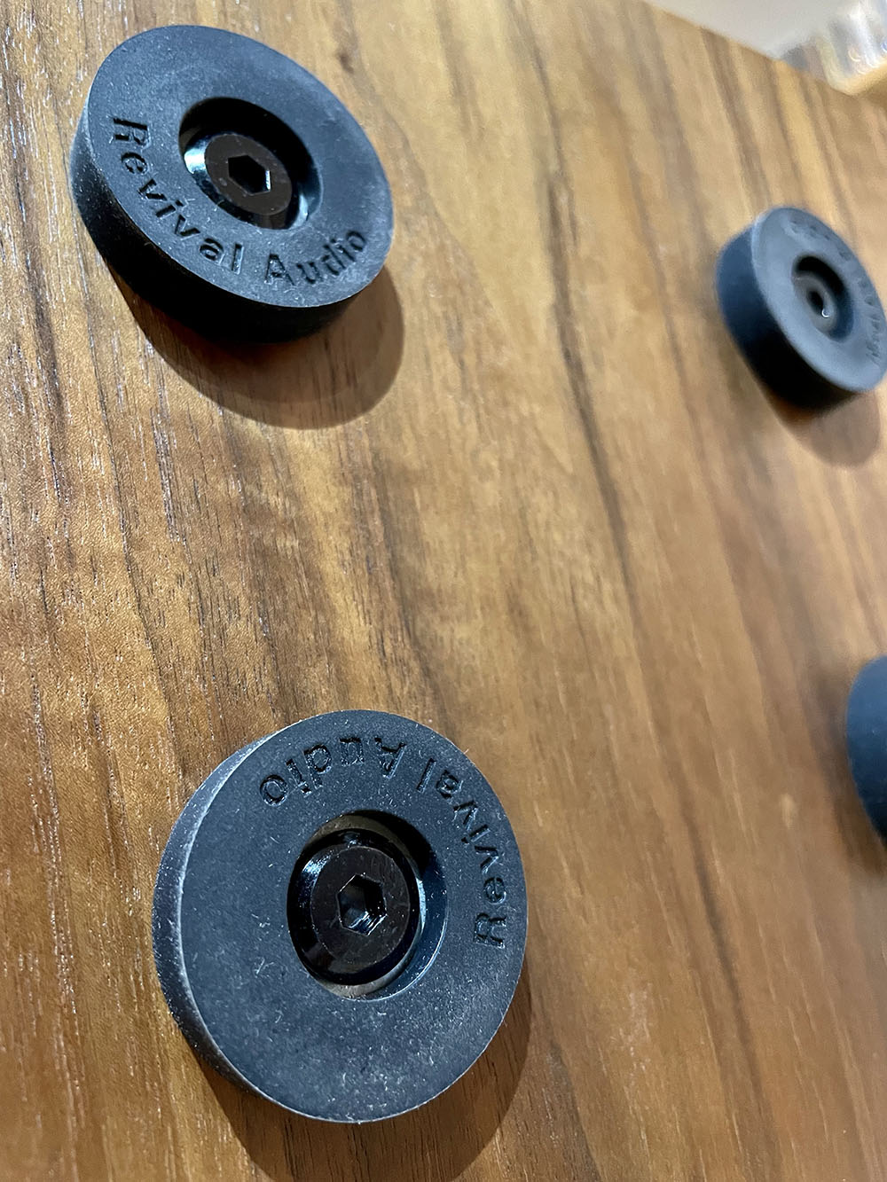 ที่ใต้ตัวตู้ของลำโพงทั้งสองข้างมีวงแหวนยางแข็งๆ อยู่ข้างละ 4 วง ถูกยึดติดอย่างแน่นหนาแข็งแรงอยู่กับส่วนฐานของตัวตู้ด้วยน็อตสกรูขนาดใหญ่ นัยว่าผู้ออกแบบต้องการให้วงแหวนยางทั้งสี่วงนี้ทำหน้าที่เป็นบัฟเฟอร์ช่วยลดแรงปะทะของส่วนฐานของตู้ที่จะกระทำกับแผ่นแพลทด้านบนของขาตั้ง ซึ่งแน่นอนว่า คุณแดเนี่ยล แกคงคาดหวังให้วงแหวนยางเหล่านี้ช่วยลดเรโซแนนซ์ของตัวตู้นั่นแหละ..