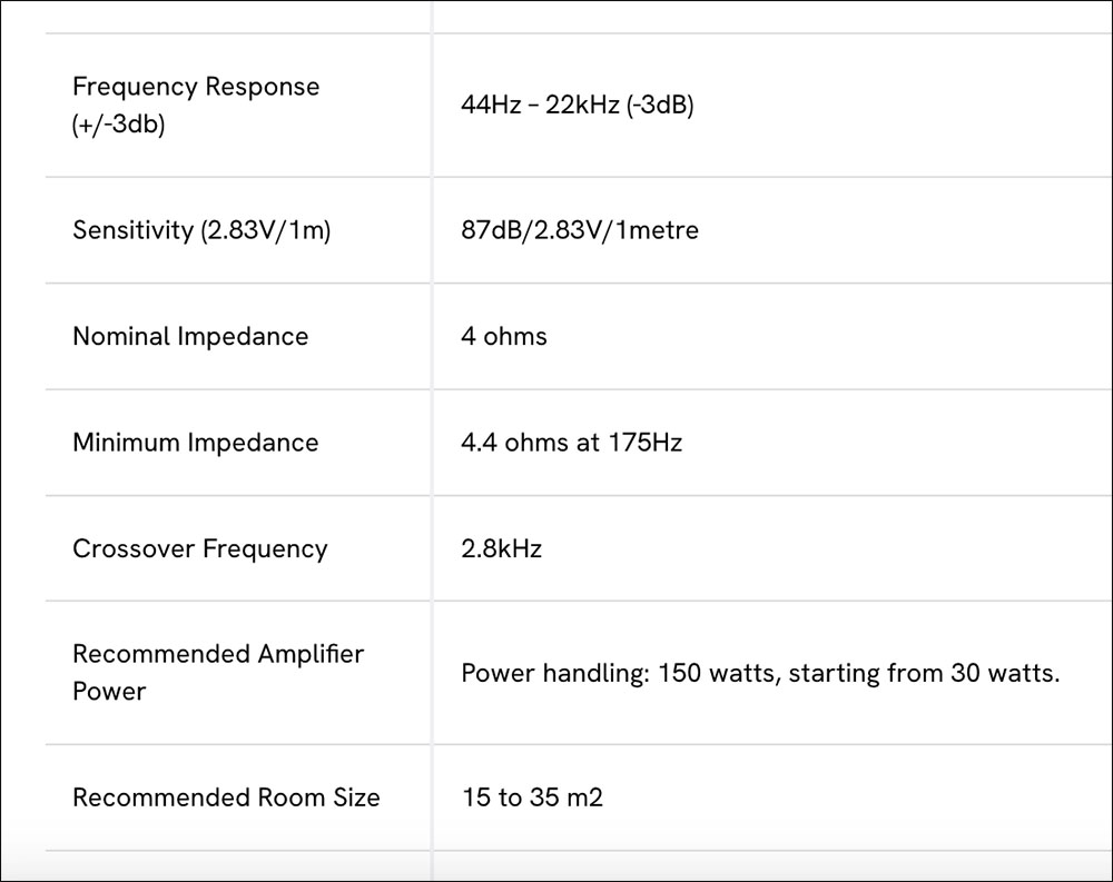 ความสามารถในการรับมือกับ ความดังของสัญญาณเสียง (pure music) ของลำโพงคู่นี้อยู่ที่ 150W ซึ่งทางผู้ผลิตแนะนำให้เริ่มต้นด้วยกำลังขับของแอมป์ อย่างต่ำที่ 30W โดยมีขนาดของห้องฟังที่แนะนำไว้ด้วยคืออยู่ที่ 15 – 35 ตารางเมตร คิดเป็นสัดส่วน กxย ของห้องก็อยู่ราวๆ 3×5 ตรม. ถึง 5×7 ตรม. ก็ถือว่าครอบคลุมขนาดห้องได้กว้างมาก แต่จากประสบการณ์ เมื่อดูจากขนาดลำโพงเทียบกับขนาดห้องที่ผู้ผลิตบอกมา ผมคิดว่า ถ้าคุณเป็นคนที่ชอบฟังเสียงเข้ม ชอบเปิดดังและเป็นเสียงที่สวิงไดนามิกได้กว้างๆ แบบเต็มสเกลจริงๆ กับลำโพงขนาดตู้ประมาณนี้ น่าจะไปได้ดีกับห้องที่มีขนาดไม่เกิน 4×6 ตรม. ถ้าไปลงในห้อง 5×7 ตรม. ผมว่าเสียงมันจะจางไปหน่อย เนื้อเบสน่าจะไม่พอแผ่คลุมพื้นที่ห้องที่ใหญ่ขนาดนั้น ต่อให้อัดแอมป์เข้าไป 150W เต็มสเปคฯ ที่ลำโพงรับได้ก็เถอะ..!