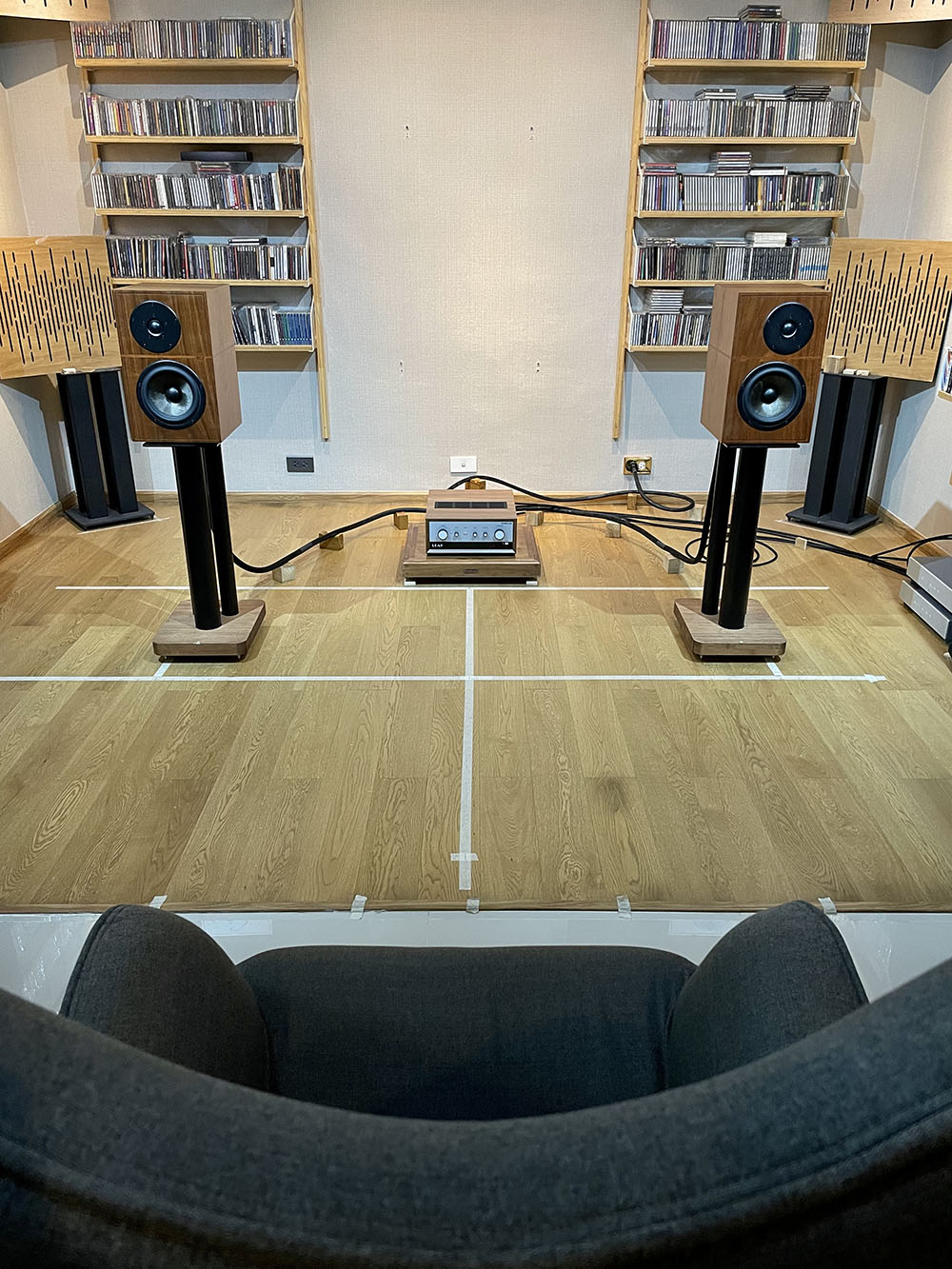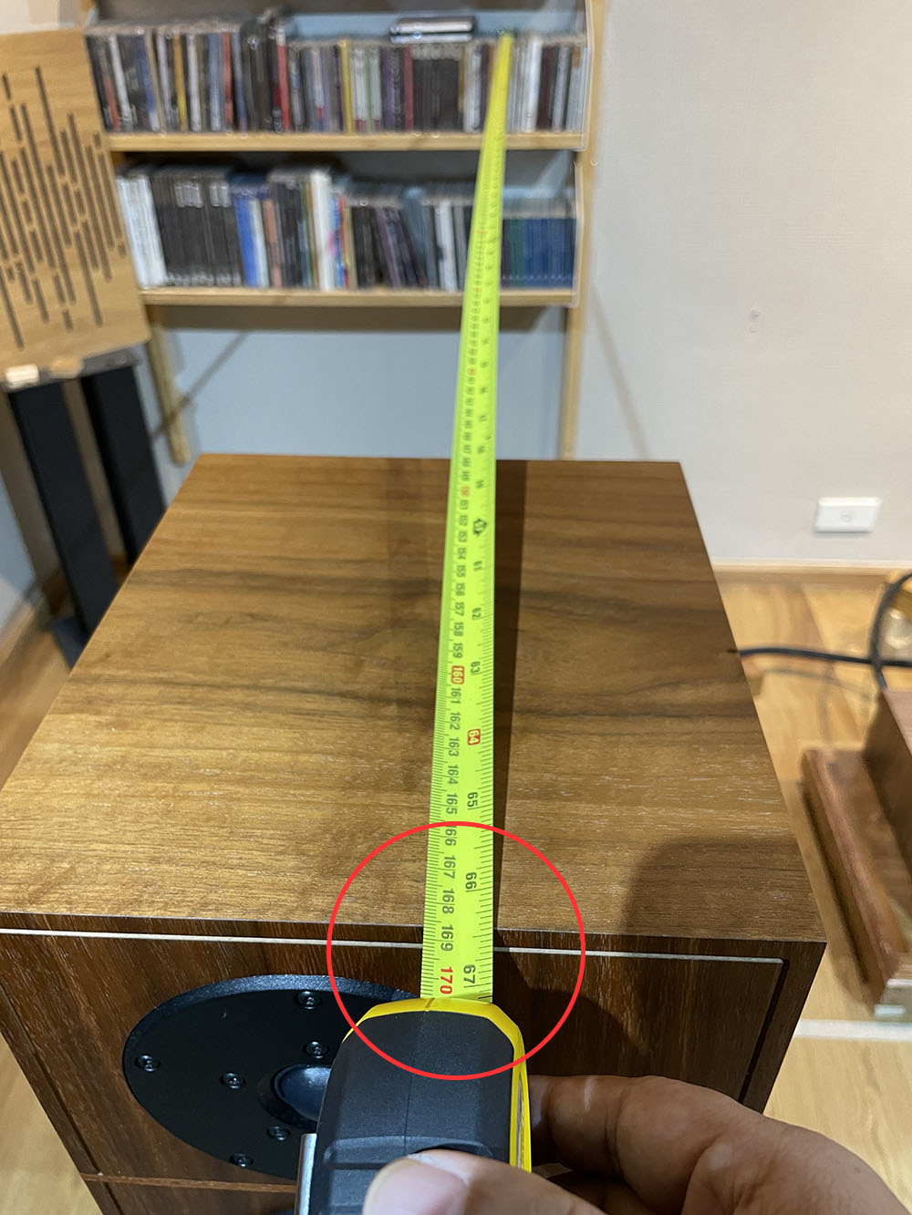 ส่วนระยะห่างผนังหลัง หลังจากทดลองขยับเดินหน้าถอยหลังอยู่พักใหญ่ ผมพบว่า ถึงแม้ว่าจะเป็นลำโพงตู้เปิดที่มีท่อระบายเบสขนาดใหญ่ยิงออกทางด้านหลัง แต่ลำโพงคู่นี้ก็ยังต้องการผนังหลังเข้ามาช่วยหนุนเพื่อให้ได้โทนัลบาลานซ์ที่แน่นและสมดุล ระยะสุดท้ายที่ให้เสียงลงตัวมากที่สุดคือระยะห่างหลังอยู่ที่ 168.5 .. ซึ่งได้ผลรวมที่ดีที่สุดตอนขับด้วย LEAK Stereo 230 แต่เมื่อเปลี่ยนมาขับด้วยแอมป์ที่มีกำลังขับสูงๆ เสียงที่ออกมาจะกระชับมากเกินไป ไม่ว่าจะพยายามดึงลำโพงถอยห่างผนังหลังออกมามากขึ้น หรือดันเข้าไปชิดผนังหลังมากขึ้นก็ช่วยให้เสียงผ่อนลงไม่ได้มาก สรุปคือ ให้แม็ทชิ่งแอมป์ให้ลงตัวให้มากที่สุดก่อนแล้วค่อยเซ็ตหาตำแหน่งที่ลงตัว