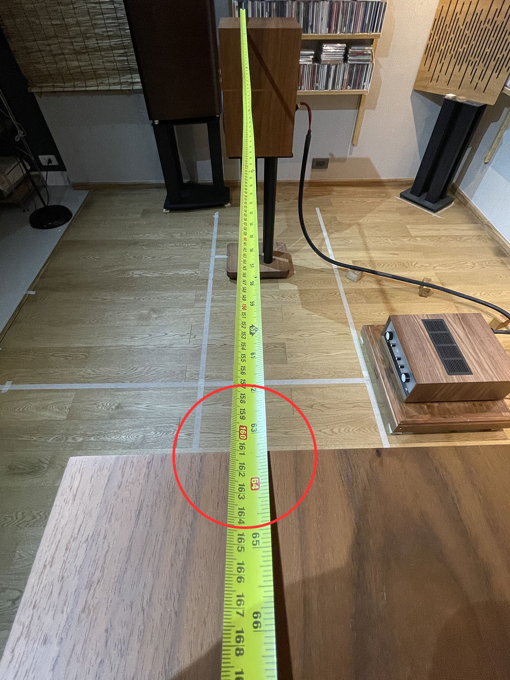 ห้องฟังของผมมีสัดส่วนอยู่ที่ 3.6x6.6 = 23.67 ตรม. ถือว่าอยู่ในพิกัดที่ผู้ผลิตลำโพงคู่นี้แนะนำไว้ หลังจากทดลองขยับตำแหน่งจากจุดเริ่มต้นตามสูตร ซ้ายขวา = 180 .. และห่างหลังที่ระยะ ความลึกของห้อง หารด้วย 3 คือ 6.6 หาร 3 = 2.2 เมตร (220 ..) ในขั้นตอนแรกของการไฟน์จูนระยะชิดซ้ายขวาเพื่อหาระยะโฟกัส ผมพบว่า ลำโพงคู่นี้ต้องการระยะห่างซ้ายขวาอยู่ที่ 161 .. ซึ่งเป็นระยะที่ทำให้โฟกัสของเสียงคมชัดที่สุด (ไม่โทอิน) และมีผลให้ความเข้มของสนามเสียงทั้งซ้ายกลางขวา มีความเสมอสมานกันตลอด ไม่มีอาการโหว่กลาง