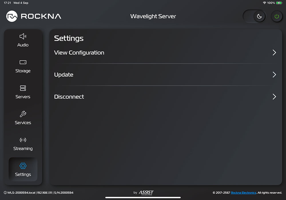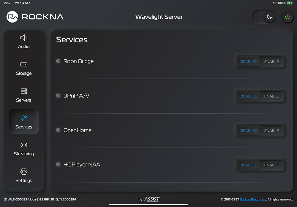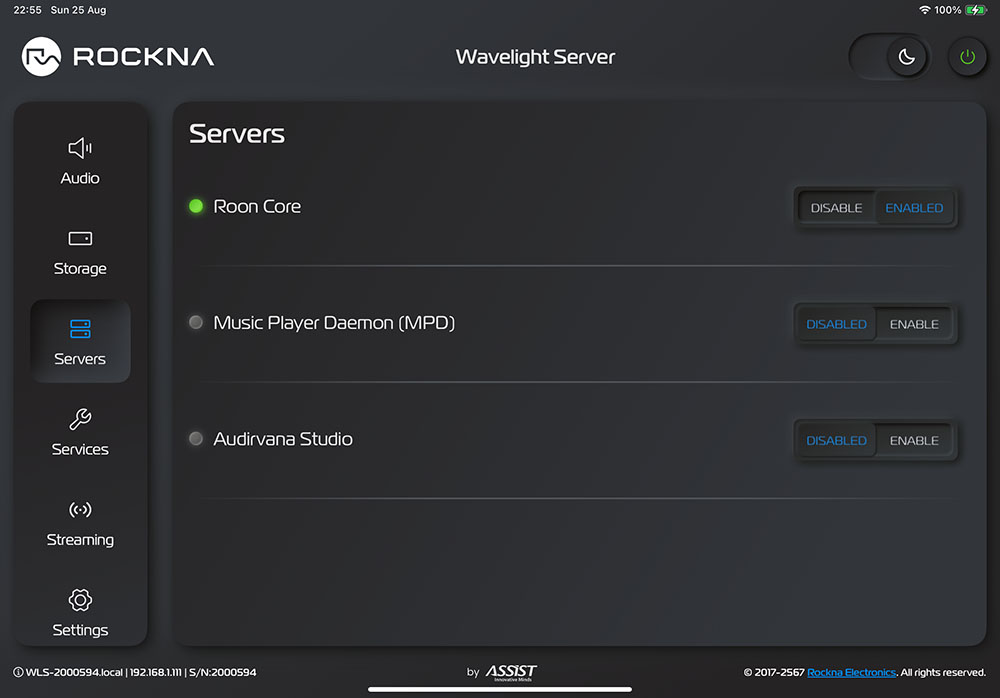 เมนูนี้ใช้สำหรับเลือกโปรแกรมมิวสิค เซิร์ฟเวอร์ที่ใช้ควบคุมการเล่นไฟล์เพลง ซึ่งมีให้เลือกตามที่ผู้ผลิตติดตั้งไว้ให้ และจำนวนของโปรแกรมที่มีให้เลือกใช้นี้จะเพิ่มขึ้นในอนาคต โดยที่ทางผู้ผลิตจะใช้วิธีติดตั้งโปรแกรมไว้ในเซิร์ฟเวอร์ของเขาแล้วแจ้งให้ผู้ใช้ทำการอัพเดตเฟิร์มแวร์เพื่อเพิ่มจำนวนโปรแกรม ซึ่งตอนที่ผมได้รับเครื่องมาทดลองฟังช่วยแรกจะมีแค่โปรแกรม Roon Core กับ Music Player Daemon (MPD) สองโปรแกรมนี้เท่านั้นที่เปิดให้ใช้งานได้ แต่พวกเขาเพิ่งจะมีอัพเดตเฟิร์มแวร์ใหม่เป็นเวอร์ชั่น 1.04 ซึ่งจะมีการอัพเดต API (Application Programming Interface) เป็นเวอร์ชั่น 1.29 ซึ่งเป็นเวอร์ชั่นปัจจุบันโดยเพิ่มโปรแกรม Audirvana Studio เข้ามาให้เลือกใช้อีกโปรแกรม (*ถ้าต้องการใช้โปรแกรม Roon หรือ Audirvana Studio คุณต้องเข้าไปสมัครขอใช้บริการและเสียค่าบริการรายเดือนซะก่อน เพื่อให้ได้ username กับ password ของโปแกรมนั้นๆ มากรอกลงในแอพฯ WLS ถึงจะใช้งานได้ ใครที่มีแอคเคาต์ของ Roon หรือ Audirvana Studio อยู่แล้วก็ไม่ต้องไปสมัครใหม่ แค่เอายูสเซอร์เนมกับพาสเวิร์คที่มีอยู่มากรอกก็ใช้งานได้แล้ว ในอนาคตอาจจะมีโปรแกรมอื่นๆ เพิ่มเติมเข้ามาอีก เพราะผู้ผลิตใช้วิธีเขียนโปรแกรมลงบน FPGA ทำให้สามารถอัพเดตไปได้เรื่อยๆ