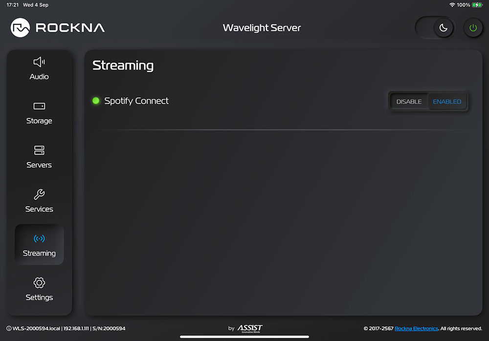 ตรงนี้เป็นการปรับตั้งให้ WLS ทำงานเป็น endpoint อีกรูปแบบหนึ่ง คือเป็น “ปลายทาง” ที่รองรับสัญญาณจากโปรแกรมเล่นไฟล์เพลงของผู้ให้บริการสตรีมไฟล์เพลงที่มีระบบเพลย์แบ็คเป็นของตัวเอง ซึ่งในตอนนี้ WLS สามารถรองรับสัญญาณจากการสตรีมด้วยโปรแกรม Spotify Connect ได้ (*ในอนาคตอาจจะเพิ่มการรองรับ TIDAL Connect เข้ามาด้วยก็เป็นได้) ซึ่งผู้ที่ต้องการใช้งานฟังท์ชั่นนี้จะต้องสมัครใช้งาน Spotify แบบ Premium เท่านั้น แบบ Free จะใช้ฟังท์ชั่นนี้ไม่ได้ (*ใครใช้ Spotify แบบฟรีอยู่ ถ้าต้องการเล่นผ่าน WLS ต้องป้อนสัญญาณเข้าทาง AirPlay ของ WLS แทน แต่คุณภาพเสียงจะสู้เข้าทาง Spotify Connect ไม่ได้ และคุณต้องเปิดมือถือตลอดด้วย)