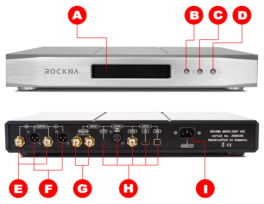 DAC ตัวนี้มีอินพุตให้เลือกใช้ 5 ช่อง ซึ่งแต่ละอินพุตจะมีความสามารถรองรับสัญญาณที่แตกต่างกัน โดยช่องที่รองรับสัญญาณได้กว้างที่สุดก็คือช่องอินพุต USB กับช่อง I2S ซึ่งกรณีที่จะนำ Wavelight DAC มาจับคู่ใช้กับ Wavelight Server ทาง Rockna แนะนำให้ใช้วิธีเชื่อมต่อสัญญาณทางอินเตอร์เฟซ I2S ซึ่งจะได้ประโยชน์จาก WLS เต็มที่คือได้รับมรรคผลจากฟังท์ชั่น Upsampling และ PCM>DSD Transcoding ในขณะที่ทางเอ๊าต์พุต USB ของ WLS จะไม่ได้ประโยชน์จากฟังท์ชั่น Upsampling และ PCM>DSD Transcoding