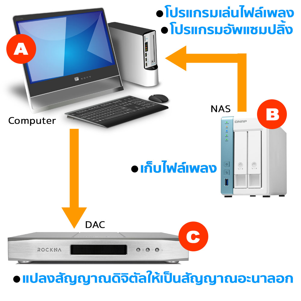 ส่วนเพลงที่เราจะเลือกมาฟังสำหรับการสตรีมมิ่งในยุคแรกๆ ที่ยังไม่มีบริการของ TIDAL เราก็จะใช้วิธีริปสัญญาณ PCM จากแผ่นซีดีออกมาเป็น “ไฟล์เพลง” รูปแบบใดรูปแบบหนึ่ง (WAV หรือ AIFF หรือ FLAC ฯลฯ) แล้วเอาไปเก็บไว้ใน NAS (Network Attached Storage) (B) ซึ่งก็คือฮาร์ดดิสประเภทที่เชื่อมต่ออยู่ในวงเน็ทเวิร์ค เมื่อถูกร้องขอจากโปรแกรมเล่นไฟล์เพลงบนคอมพิวเตอร์ NAS ก็จะส่งไฟล์เพลงไปให้กับโปรแกรมที่ใช้เล่นไฟล์เพลงบนคอมพิวเตอร์ผ่านทางระบบเน็ทเวิร์ค หลังจากโปรแกรมเล่นไฟล์เพลงทำการแตกไฟล์ WAV หรือ FLAC ที่ได้รับมาจาก NAS เพื่อดึงเอาสัญญาณ PCM ออกมาได้แล้ว โปรแกรมเล่นไฟล์เพลงบนคอมพิวเตอร์จะจัดส่งสัญญาณ PCM นั้นไปให้กับ DAC (C) เพื่อให้นำไปแปลงออกมาเป็นสัญญาณอะนาลอกและจัดส่งไปให้กับแอมปลิฟายเพื่อนำไปจัดการในขั้นตอนต่อไป