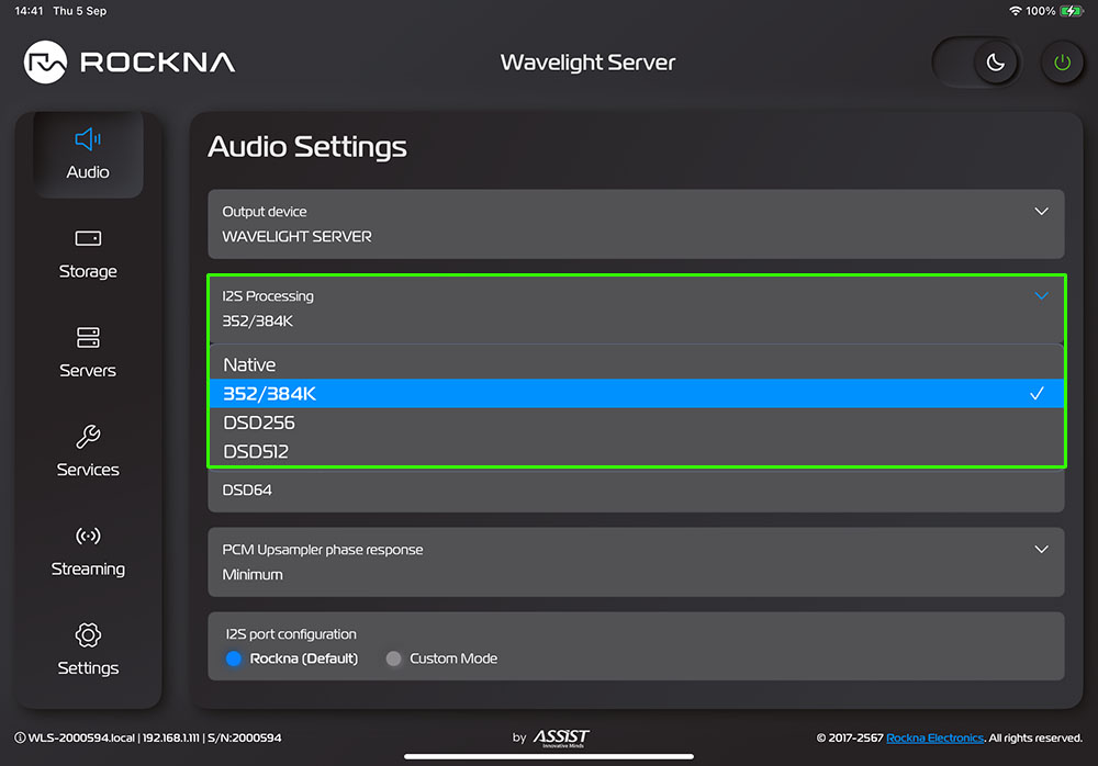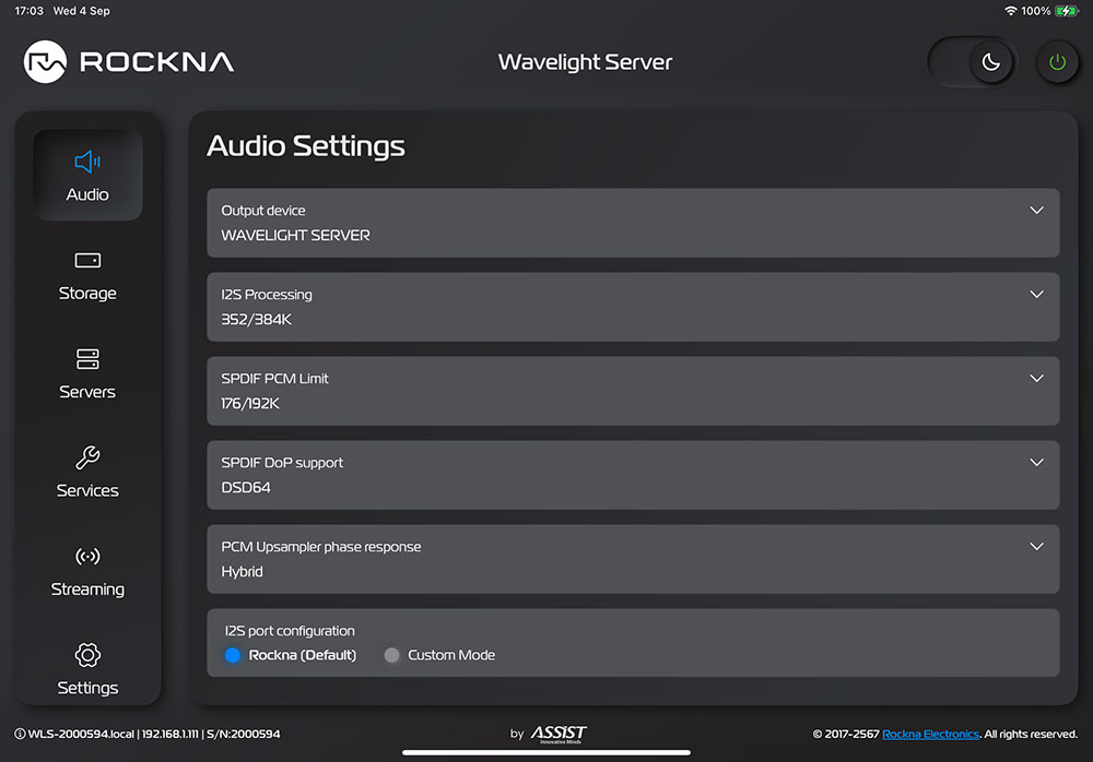 6. I2S port configuration = เป็นการเลือกลักษณะการเชื่อมต่อสำหรับช่องเอ๊าต์พุต I2S ซึ่งถ้าใช้ร่วมกับ DAC ของ Rockna เอง ให้เลือกไปที่ตำแหน่ง ‘Rockna (Default)’ แต่ถ้าใช้กับ DAC ยี่ห้ออื่นที่มีอินพุต I2S แต่กำหนดรูปแบบการเชื่อมต่อไว้ต่างกัน ก็ให้เลือกไปที่ตำแหน่ง ‘Custom Mode’ จะปรากฏรูปแบบของการเชื่อมต่อสัญญาณของช่องเอ๊าต์พุต I2S ของ WLS ขึ้นมาให้เลือกจำนวน 4 รูปแบบ คือ Invert bit clock, Invert left/right clock, Invert serial data และ Swap DSD channels