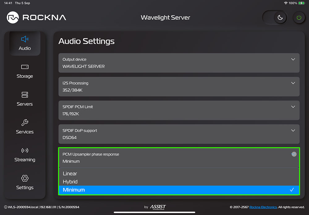 นอกจากคุณจะเลือกให้ WLS ตัวนี้ทำงานเป็น ‘Streamer Transport’ โดยใช้โปรแกรม Roon หรือ Audirvana Studio เป็นหลัก (core) ในการควบคุมการเล่นไฟล์เพลงแล้ว คุณยังสามารถปรับเลือกให้ WLS ทำงานเป็น endpoint หรือ renderer หรืออุปกรณ์ปลายทางที่รองรับสัญญาณเอ๊าต์พุตต่อมาจากโปรแกรมเล่นไฟล์เพลงอื่นๆ ได้อีกด้วย โดยมีอ๊อปชั่นให้เลือกถึง 5 อ๊อปชั่น ได้แก่ Roon Bridge (*มีประโยชน์ในกรณีที่คุณใช้ Roon บนฮาร์ดแวร์ตัวอื่นที่ไม่มีเอ๊าต์พุต SPDIF แต่ต้องการใช้งานร่วมกับ DAC ทางช่องอินพุต SPDIF), UPnP AV, OpenHome, HQPlayer NAA และ AirPlay (*รองรับการสตรีมไฟล์เพลงจากแอพฯ เล่นไฟล์เพลงบนอุปกรณ์ iOS กับคอมพิวเตอร์ MacOS)