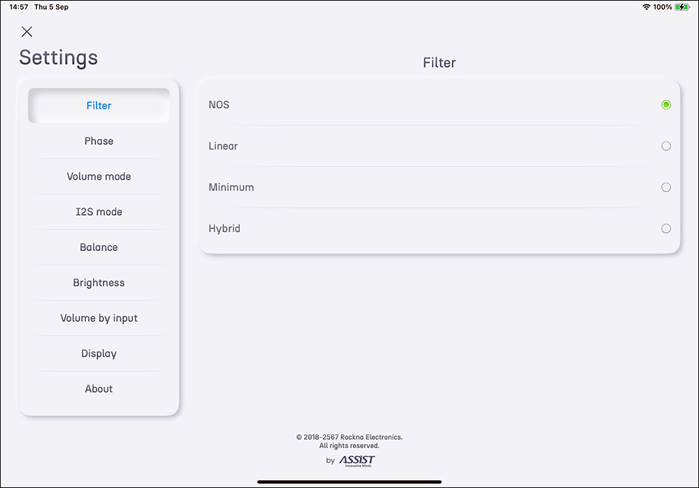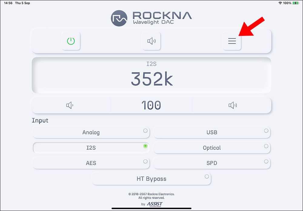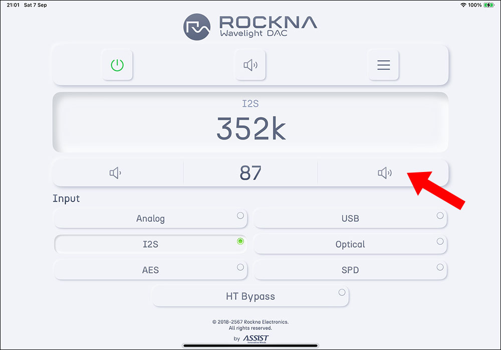 ตัว WL DAC เองก็มีแอพลิเคชั่นที่เอาไว้ให้ปรับตั้งฟังท์ชั่นต่างๆ บนอุปกรณ์พกพาเหมือนกัน ชื่อว่า Rockna Wavelight DAC (WL DAC) โหลดได้ฟรีทั้งใน App Store และ Google Play บนหน้าโฮมของแอพฯ จะแสดงรายละเอียดต่างๆ ขณะเครื่องทำงานแบบเรียลไทม์ และมีปุ่มควบคุมสั่งงานที่จำเป็นอยู่ครบ เริ่มจากปุมเปิด/ปิดเครื่อง, ปุ่ม mute, ปุ่มปรับเพิ่ม/ลดวอลลุ่ม, ปุ่มเลือกอินพุต และปุ่มเมนู (ศรชี้)