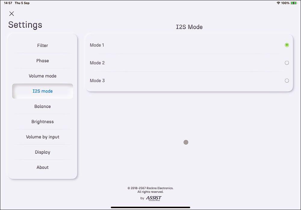 หัวข้อ Phase = เลือกไว้ที่ 0 องศา, หัวข้อ Volume mode = ไม่ใช้, หัวข้อ Balance = ตั้งไว้ตรงกลาง, หัวข้อ Brightness = ความสว่างของจอเลือกไว้ที่ 10%, หัวข้อ Volume by input = ไม่ใช้, หัวข้อ Display = เลือกปิดจอ ส่วนหัวข้อ About แค่แจ้งให้ทราบเวอร์ชั่นของแอพฯ เหลือแต่หัวข้อ ‘I2S mode’ อีกหัวข้อที่ต้องปรับให้ถูกถึงจะมีเสียง เพราะเป็นการเลือกรูปแบบการเชื่อมต่อสัญญาณของ I2S ถ้าใช้กับ WLS ต้องเลือกไว้ที่ Mode 1