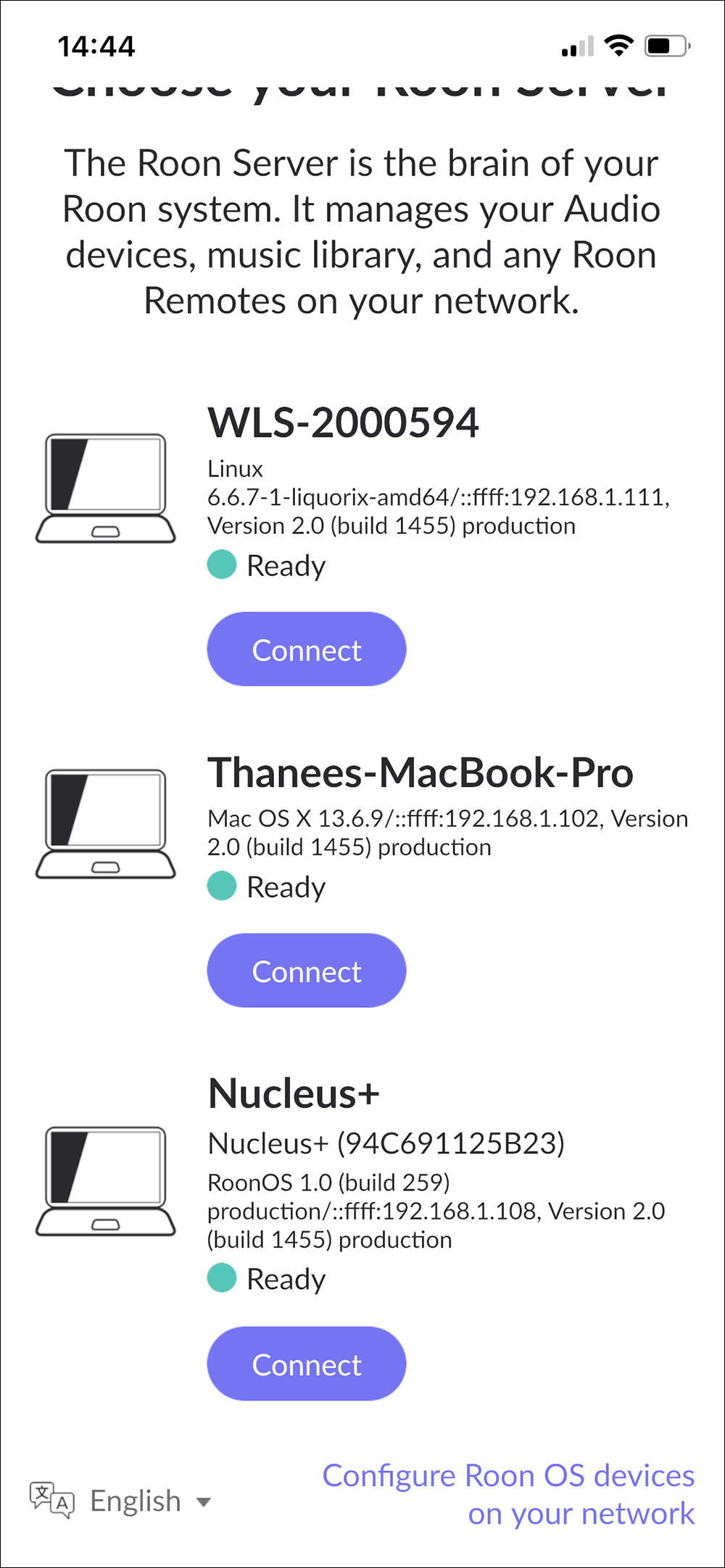 หลังจากผมเอา user-name กับ password ที่เป็นแอคเคาต์ของผมมาล็อคอิน Roon บน WLS เสร็จ ก็เท่ากับว่าตอนนี้ผมมีฮาร์ดแวร์ที่มี core ของ Roon ติดตั้งอยู่ทั้งหมด 3 ตัว ซึ่งการใช้งาน WLS มีทางเลือกให้แค่ 3 ทาง ในขณะนี้ คือถ้าไม่ใช้ระบบของ Roon ก็เหลือแค่ MPD ซึ่งไม่เวิร์คเลย กับระบบของ Audirvana Studio ซึ่งผมไม่มีแอคเคาต์ของเจ้านี้ จึงต้องใช้ Roon กับ WLS โดยปริยาย (*ขอย้ำอีกทีว่า ใครซื้อ WLS ไปใช้แล้วต้องการใช้ระบบ Roon คุณต้องเข้าไปสมัครขอใช้บริการที่เว็บไซต์ของ Roon ซะก่อนแล้วค่อยเอา user-name กับ password ที่ได้จากการสมัครมากรอกใช้กับ Roon บน WLS นั่นก็หมายความว่า คุณซื้อ WLS มาคุณก็ได้แถมฮาร์ดแวร์ที่ฝัง Roon Core มาพร้อมใช้งาน แต่คุณต้องมีแอคเคาต์ของ Roon ด้วยถึงจะใช้ได้ ซึ่งอันนี้คุณต้องไปจ่ายตังค์สมัคร ไม่ได้ฟรีนะ)
