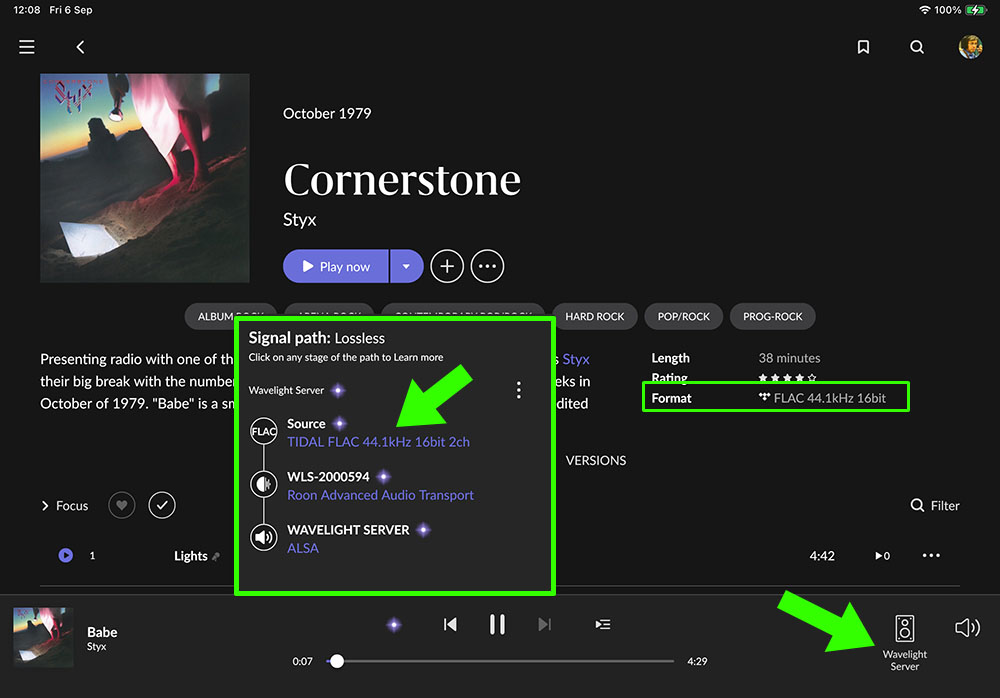 เมื่อผมทดลองเล่นไฟล์เพลงจาก TIDAL ที่เป็นไฟล์ FLAC 16/44.1 พบว่า Roon เล่นไฟล์นี้แล้วส่งสัญญาณดิจิตัลไปที่ WLS ด้วยอัตราแซมปลิ้งเท่ากับ 44.1kHz ตามต้นฉบับของไฟล์ โดยไม่ได้มีการเปลี่ยนแปลงใดๆ แต่เมื่อไปดูบนจอที่หน้าปัดของ WL DAC ซึ่งรับสัญญาณมาจาก WLS มันโชว์แซมปลิ้งเรตเท่ากับ ‘352’ ก็หมายถึงสัญญาณที่ WL DAC รับเข้ามามีแซมปลิ้งเรตอยู่ที่ 352.8kHz นั่นเอง ซึ่งก็เป็นการแสดงให้รู้ว่า ฟังท์ชั่น Upsampling ของ WLS ทำงานตามที่ผมปรับตั้งเอาไว้ ในขณะที่ WL DAC รับสัญญาณ 352.8kHz มาจาก WLS แล้วนำส่งเข้าภาค DAC โดยไม่อัพฯ เพิ่มตามที่ผมตั้งไว้ให้แปลงสัญญาณที่รับเข้ามาด้วยโหมด Native (NOS) นั่นเอง